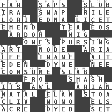 ACROSS 1. At a great distance 4. Plant excrements 8. Oscar Madison type 12. Retirement account (abbr.) 13. Fastener 14. Cause heat under the collar 15. Australian parrot (variant) 17. Pulitzer Prize-winning author Ferber 18. It is permitted: Lat. 19. Make improvements or corrections to 21. Afternoon social gathering 23. Greek goddess of the dawn 24. Zeal 26. Russian fighter aircraft 28. Singles 30. Puckering 34. Tate display 37. Connecting point 39. Roberta Peters solo 40. Area sheltered from the wind 41. Empty; void 43. Keyboard modifier key 44. Genesis locale 46. Unit of force 47. Born 48. Eat 51. Thick slice 54. Away 55. Box-office sellout 58. It is 61. Leather borer 63. Believer in; advocate of (suffix) 65. Brizilian seaport 67. Liveliness 71. Portico 72. 154 in Roman numerals 73. Words to Nanette 74. Raised railways 75. Measure of real estate 76. Colored 77. Arrange properly for use DOWN 1. Do some clerical work 2. Odor 3. More valued for its uncommonness 4. Compass dir. 5. Also 6. Baking dish 7. Argument over a trivial matter 8. _ Lanka 9. Louse (plural) 10. Margarine 11. Wagers 16. _ china 18. Den 20. Spanish title 22. Australian flightless bird 25. Painter Guido (1575-1642) 27. Girls' org. (abbr.) 29. Something which is sent 30. Actor Sean's family 31. SW Asia republic 32. "Death on the ____" 33. Yard entry 34. Actor Baldwin 35. Do over again 36. Adolescent 38. 24 hours 42. Snakelike fish 45. Overdraft (abbr.) 49. Mountain range 50. Cut the grass 52. Housemaid (var.) 53. Long, evenly shaped pieces 56. Settings 57. White Person, in Hawaii 58. South American Indian 59. Baby powder 60. Tumult 62. Grant temporary use of 64. Political cartoonist Thomas 66. "___ Maria" 68. Myrna of the movies 69. One (Scot) 70. Allow head to fall sleepily