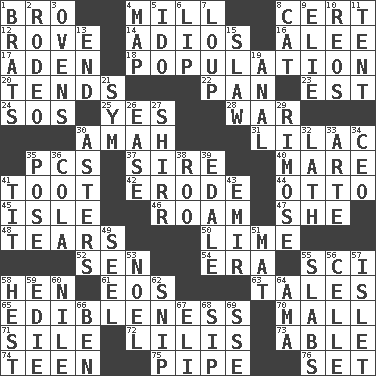 ACROSS 1. Sis' sibling 4. Place where flour is made 8. Sure thing 12. Be footloose 14. Goodbye (Sp.) 16. Toward shelter 17. Arabian gulf 18. Census information 20. Watches over 22. Baking dish 23. Eastern Standard Time (abbr.) 24. Distress signal 25. Affirmative reply 28. Armed conflict 30. Nanny 31. Pale purple color 35. Personal Computers (abbr.) 37. The founder of a family 40. Female horse 41. A blast of a horn 42. Wear away 44. Von Bismarck 45. Capri or Wight 46. Wander aimlessly 47. A female animal or person 48. Pulls into pieces 50. Citrus frut 52. Elected rep. 54. Epoch 55. _-fi 58. Layer 61. Greek goddess of the dawn 63. Falsehoods 65. The property of being fit to eat 70. Shopping center 71. Drop; flow; fall 72. Ms. Damita and namesakes 73. Competent 74. Adolescent 75. Corncob 76. Arrange properly for use DOWN 1. Naughty children 2. Cowboy competition 3. Baking chambers 4. Atlas unit 5. Wedding promise 6. Mouth edge 7. Central Nebraska county 8. Feline 9. Writer Wiesel 10. Vintage cars 11. Portable shelter 13. Conclude 15. Cole _ (cabbage dish) 19. Of or related to the anus 21. Symbol (abbr.) 26. Relaxation 27. Bake eggs in their shells 29. Full of chinks, cracks, or crevices 30. Michaelmas daisies 32. Thin strip of wood or metal 33. Johnson of "Laugh-In" 34. Corporate head (abbr.) 35. Introduce or present, as a question 36. Root beer relative 38. Friend of Pooh 39. Peak District village in England 41. Teat (slang) 43. Arab leader 49. Sew up the eyelids of hawks and falcons 51. Floor protector 53. Christmas carol 55. Thick slices 56. Cell (Danish) 57. Small island 58. Command 59. Singer Brickell 60. Mediterranean tributary 62. Clip 64. Nanny (var.) 66. Benjamin's nick name 67. Biblical high priest 68. Small drink 69. Compass dir.