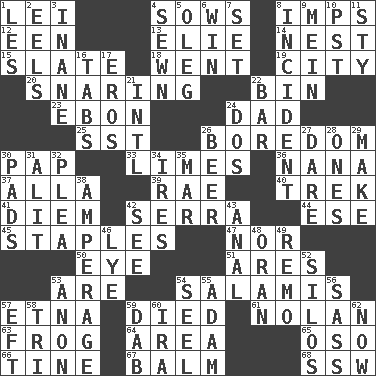 ACROSS 1. Flowery wreath 4. Sty mamas 8. Naughty children 12. Car or cant ending 13. Writer Wiesel 14. A home for chicks 15. Chalkboard 18. Left 19. Municipality 20. Catching in a trap 22. Storage container 23. Inky black, to poets 24. Male parent 25. Fast jet (abbr.) 26. Mood resulting from idleness 30. Infant food 33. Citrus fruits 36. Nanny 37. Silent film actress Nazimova 39. Actress Charlotte 40. Long journey 41. South Vietnam president (1954) 42. Father Junipero _ 44. Compass dir. 45. Paper fasteners 47. And not 50. Sight organ 51. Ancient Greek god of war 53. "We ___ not amused" (Victoria) 54. Deli grouping 57. Inactive volcano in Sicily 59. Passed on 61. Pitcher Ryan 63. Tree-dwelling hopper 64. Length times width 65. Bear (Spanish) 66. Prong on a fork 67. Lip ointment 68. Compass dir. DOWN 1. French article 2. Snakelike fish 3. Silly 4. Stitched 5. Cassini of fashion 6. Victory 7. Put into a specified state 8. Event 9. Chow _ 10. Pacific Standard Time (abbr.) 11. Filthy place 16. Bar bills 17. Greek god of love 21. International (abbr.) 22. Oblong piece of solid material 24. Two (Sp.) 26. Fermented drink made from hops 27. Have the gumption 28. Singles 29. Cause to be 30. Writing tablets 31. Came down and settled, as after flight 32. Entreaty 34. Angers 35. Spoil 38. Electrical Measurement 42. Perceive with the eye 43. Of or related to the anus 46. Sodium hydroxide 48. Northwest Algerian city 49. San ____ (Riviera town) 52. Grain storage towers 53. Soon (poet.) 54. Sew up the eyelids of hawks and falcons 55. First man 56. Backtalk 57. Lizard (obsolete) 58. Three (prefix) 59. Small moist lump or mass 60. Lyricist Gershwin 62. At this time