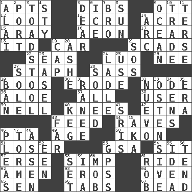 ACROSS 1. Flats, for short 5. Claim 9. Baseball player Mel 12. Spoils 13. Shade of tan 14. 43,560 square feet 15. Like ___ of sunshine 16. A really long time 17. Stern 18. It would 19. 4-wheeled motor vehicle 21. Oodles 22. Oceans 24. Nilotic language 26. Born 27. Staphylococcus 28. Backtalk 29. Expressions of contempt or scorn 30. Wear away 32. Thickened enlargement 36. _ vera 37. 100% 38. One who makes use of a thing 39. 1994 drama film starring Jodie Foster 40. Leg joints 42. Inactive volcano in Sicily 43. Nourish 44. All-night dance parties 46. Parent Teacher Assoc. 49. Mature 50. Picture 51. Failure 53. Girls' org. (abbr.) 54. Be seated 57. Celtic language 58. Simple or foolish person 61. Travel on or in a vehicle 62. So be it 63. Greek god of love 64. Baking chamber 65. Elected rep. 66. Bar bills 67. Necklace unit DOWN 1. Mountain range southwest of Kyrgyzstan 2. Sweet dark-red dessert wine 3. Inedible or poisonous agaric 4. Filthy place 5. Letter starter 6. Frozen water 7. Sis' sibling 8. Player for Phoenix 9. Sea 10. Swap 11. Laconic 14. Curve 19. Head covering 20. American tennis player Robert 21. Distress signal 23. Artist's stand 24. Dipping utensil 25. Purpose 27. Not divided or shared with others 28. Having a sole or soles 29. Bar 31. The wife of a rajah (variant) 32. New (sp.) 33. Clearly or manifestly demonstrative 34. Lairs 35. Period 40. Barrel 41. Indian titles of respect 43. At a great distance 45. Alias (abbr.) 46. Entreaties 47. Singer Mel 48. NE Netherlands city 52. Car or cant ending 53. Global Positioning Systems (abbr.) 55. It may be bright or harebrained 56. Watch over 58. Put into a specified state 59. Retirement account (abbr.) 60. Crowd into 61. Director Reiner