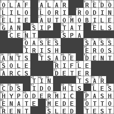 ACROSS 1. Norwegian king 5. Having or resembling wings 9. Redecorate 13. _ and Stitch 14. Australian parrot (variant) 15. "The Thinker" sculptor 16. Writer Wiesel 17. Form of transportation 19. Separate the seeds from cotton 20. Small drink 21. Make lace 22. Raised railways 23. Penny 25. Health resort 26. Fertile tracts in a desert 30. Backtalk 34. From or relating to Ireland 35. Greek god of love 36. Pismires 39. Sadhe (variant) 42. Gouge 43. Not divided or shared with others 44. Firearm 46. Curves 47. Prevent from occurring 48. Shallow baking pan 51. Russian ruler of old 54. Music discs 57. Wedding promise 58. Part of HMS, perhaps 60. French article 62. Under the skin 65. Romantic infatuation 66. Related on the mother's side 67. Ancient Persian 68. Von Bismarck 69. Monthly bill 70. Downhill vehicle 71. Trial DOWN 1. Cassini of fashion 2. Pale purple color 3. Place in a line 4. Enemy 5. Mountain range southwest of Kyrgyzstan 6. Central Nebraska county 7. Tate display 8. Debaucheries 9. Director Reiner 10. Singer Brickell 11. Deli pickle 12. Washington bills 15. Round or rotation of duties 18. Atlas unit 20. Play the lead 24. Annoying sounds 27. Be seated 28. Curvy letter 29. Pottery fragment 30. Spring feasts 31. "We ___ not amused" (Victoria) 32. Boy, to dad 33. Fast jet (abbr.) 36. White ___ sheet 37. And not 38. Affectionate concern, for short 40. Pass on 41. Newt 45. Allows 48. Event that recurs at intervals 49. Binary compound 50. Typical standards 52. Having winglike extensions 53. Musical pauses 54. "Mermaids" star 55. Unit of force 56. Connect, as a bridge 58. Flintstone garb 59. On the rocks 61. Went for two points 63. Baseball player Mel 64. Cartoonist voice _ Blanc 65. Cooking vessel