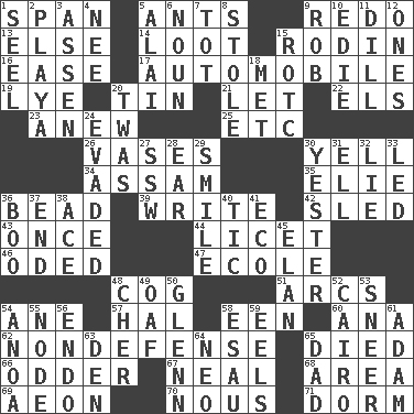 ACROSS 1. Connect, as a bridge 5. Pismires 9. Make new 13. Otherwise 14. Plunder 15. "The Thinker" sculptor 16. Relaxation 17. Car 19. Potassium hydroxide 20. Shallow baking pan 21. Allow 22. Raised railways 23. Afresh 25. And so on (abbr.) 26. Flower holders 30. Shout 34. Indian state 35. Writer Wiesel 36. Necklace unit 39. Compose 42. Downhill vehicle 43. Single time 44. It is permitted: Lat. 46. Wrote a lyric poem 47. Learning spot: Fr. 48. Gear tooth 51. Curves 54. A saturated hydrocarbon 57. Actor Linden 58. Car or cant ending 60. Santa ___, CA 62. Unrelated to defense, as in spending 65. Passed on 66. More peculiar 67. Be tempered by heat 68. Type of rug 69. Period of immesurable duration 70. Common sense 71. Dormintory (informal) DOWN 1. Sew up the eyelids of hawks and falcons 2. Beach, in Buenos Aires 3. NE Netherlands city 4. Born 5. Mountain range southwest of Kyrgyzstan 6. Part of speech 7. Small child 8. Fur scarf 9. Director Reiner 10. Singer Brickell 11. Deli pickle 12. Washington bills 15. College mil. group 18. Was introduced to 20. It was, poetically 24. Eluded 27. Compass dir. 28. Hearing organ 29. Grin 30. Last 31. Pipe bend 32. Whopper 33. Directed 36. Oct. 31 cry 37. Conclude 38. Adept person 40. Nervous spasm 41. Environmental prefix 45. Style 48. "Mermaids" star 49. Clumsy lout 50. American astronaut and politician John 52. Capital of Egypt 53. Scornful expression 54. Small Philippine buffalo 55. Thickened enlargement 56. Inside; within (prefix) 58. He sold his birthright 59. Snakelike fish 61. First of billions? 63. Lair 64. Modern: prefix 65. June honoree