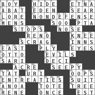 ACROSS 1. Male child 4. Flintstone garb 8. Inactive volcano in Sicily 12. Blind as ____ 14. Paradise 15. Singe 16. Old wives' tales, e.g. 17. Unrelated to defense, as in spending 20. Not women's 21. "Barney Miller" actor Jack 22. Parent Teacher Association (abbr.) 23. Halts 27. Characteristic smell of wine 29. Western Nevada city 31. Leg joint 34. Strangle with an iron collar 35. Lodging establishments 36. 90 degrees 39. Travel a route regularly 41. Sight organs 42. "Beetle Bailey" pooch 43. Vices 46. Indian skirt 47. Tenth: prefix 48. 43,560 square feet 51. Not well drained, as in land 54. Make lace 56. RI univ. 58. I made a mistake 61. Pleas 66. Costume for a special activity 67. Small Philippine buffalo 68. Haul 69. Woody plant 70. French philosopher Descartes 71. At one time in the past 72. Eastern Standard Time (abbr.) DOWN 1. Lip ointment 2. Mitch Miller's instrument 3. Tall tales 4. Layer 5. Wedding promise 6. Lair 7. Conclusions 8. Compass dir. 9. 3-inch nail 10. Political cartoonist Thomas 11. Length times width 13. Trial 18. A really long time 19. Egg _ yung 24. The grampus (Milton) 25. For each 26. Fastener 28. Atmospheres 30. Stared at amorously 32. Compass dir. 33. Double-curved letter 34. Unemotional 36. Greek goddess of the dawn 37. "One Day ___ Time" 38. Ski resort town in Vermont 40. Jacques Cousteau's middle name 44. Frozen water 45. Whopper 49. Sorrow 50. Epoch 52. Mail 53. You are 54. Separate forcefully 55. Singer Murray 57. "Tell ____ the Marines!" 59. Sliced desserts 60. Proofreading order 62. Actress Charlotte 63. Electrically charged atom 64. And so on (abbr.) 65. Observe