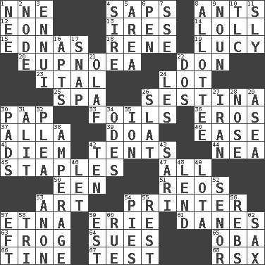 ACROSS 1. Compass dir. 4. Plant excrements 8. Pismires 12. A really long time 13. Angers 14. Hang loosely or laxly 15. Ferber et al. 18. French philosopher Descartes 19. "I Love _" 20. Normal relaxed breathing 22. Spanish title 23. Slanted text style (abbr.) 24. Car dealer's back yard 25. Health resort 26. French poetic form 30. Infant food 33. Fencing necessities 36. Greek god of love 37. Silent film actress Nazimova 39. ___ good deed 40. Relaxation 41. South Vietnam president (1954) 42. Portable shelters 44. Teachers' org. 45. Paper fasteners 47. 100% 50. Car or cant ending 51. Vintage cars 53. Tate display 54. Hard copy producer 57. Inactive volcano in Sicily 59. One of the Great Lakes 61. Natives or inhabitants of Denmark 63. Toadlike animal 64. Institutes legal proceedings 65. Chief or king in Benin or Nigeria 66. Prong on a fork 67. Trial 68. Acura sports coupe DOWN 1. Born 2. Connecting point 3. World-weariness 4. The founder of a family 5. Length times width 6. Fenced enclosure 7. Compass dir. 8. One to whom something is allotted 9. Part of speech 10. Affectionate concern, for short 11. Playfully artful 16. Tenement units (abbr.) 17. Fastener 21. Norwegian king 22. Two (Sp.) 24. French article 26. Narrow board 27. SW Asia republic 28. Sense of smell 29. At sea 30. Groovy apts. 31. Set down 32. Entreaty 34. Lyric poems 35. Electrically charged atom 38. Electrical Measurement 42. "___ Little Indians" 43. Indian skirt 46. Allow 48. Grant temporary use of 49. Globular water bottle used in Asia 52. Sir (Sp.) 53. At once, immediately (arch.) 54. Sliced desserts 55. State of inaction 56. Confederate soldiers (slang) 57. Bank Draft (abbr.) 58. Three (prefix) 59. Eastern Standard Time (abbr.) 60. Regret 62. Saxophone