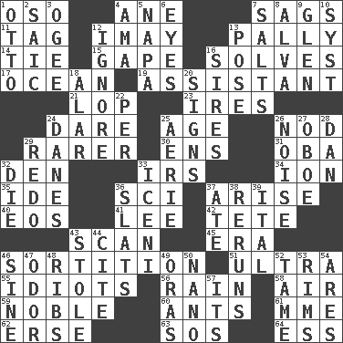 ACROSS 1. Bear (Spanish) 4. One (Scot) 7. Droops 11. Label 12. "If ____ say so..." 13. Chummy 14. Standoff 15. Open wide 16. Finds the solution 17. Sea 19. Aide 21. Chop off 23. Angers 24. Have the gumption 25. Ripen 26. Allow head to fall sleepily 29. Less widely known 30. Followers of ems 31. Chief or king in Benin or Nigeria 32. Lair 33. Big collection agency 34. Electrically charged atom 35. Binary compound 36. _-fi 37. Get up 40. Greek goddess of the dawn 41. Area sheltered from the wind 42. Wig 43. Glance over 45. Epoch 46. Determination 51. Extreme 55. Foolish or stupid persons 56. Precipitation 58. Atmosphere 59. Impressive in appearance 60. Pismires 61. Madame (abbr.) 62. Celtic language 63. Mayday 64. Double-curved letter DOWN 1. "Beetle Bailey" pooch 2. Ketch in the Levant 3. Double curve, resembling the letter S 4. Nanny (var.) 5. California wine valley 6. Sight organs 7. Table seasonings 8. Inventor's middle name 9. Small, secluded valley 10. System (abbr.) 12. Dismiss 13. Introduce or present, as a question 16. Fathers 18. Having or resembling wings 20. Signals 22. For each 24. Natives or inhabitants of Denmark 25. Nest on high 26. Annoying sound 27. Mitch Miller's instrument 28. Daniel's nick name 29. Do over again 32. Pass on 33. Ancient Celtic tribe of eastern Britain 36. Narrow boards 37. Had dinner 38. Summer TV shows 39. Slanted text style (abbr.) 43. Took without asking 44. Quote 46. Trig term 47. Scent 48. Chest bones 49. Mouths or openings 50. Billionth: prefix 52. Docile 53. Basketball hoops 54. Ancient Greek god of war 57. It is