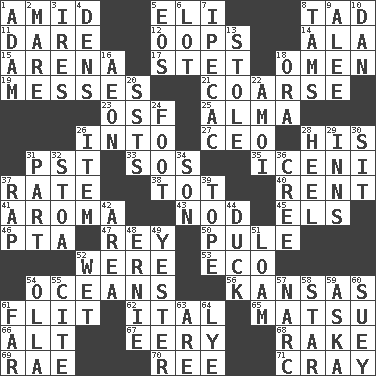 ACROSS 1. Among 5. Connecticut Ivy Leaguer 8. Bit 11. Have the gumption 12. I made a mistake 14. Wing 15. Sports stadium 17. Proofreading order 18. Sign of something about to happen 19. Makes clutter 21. Unrefined 23. Order of Saint Francis (abbr.) 25. _ mater 26. To the inside or interior of 27. Corporate head (abbr.) 28. Part of HMS, perhaps 31. Pacific Standard Time (abbr.) 33. Mayday 35. Ancient Celtic tribe of eastern Britain 37. Pace 38. Small child 40. Monthly bill 41. Odor 43. Lower and raise head in agreement 45. Raised railways 46. Parent Teacher Association (abbr.) 47. Marina Del _, California 50. Whine 52. We are 53. Environmental prefix 54. Seas 56. Sunflower state 61. Sudden quick movement 62. Slanted text style (abbr.) 65. Taiwanese island in East China Sea 66. Keyboard modifier key 67. Suggestive of the supernatural 68. Libertine 69. Actress Charlotte 70. To separate or throw off 71. Supercomputer manufacturer DOWN 1. First of billions? 2. Female horse 3. Angers 4. Cub Scout units 5. Greek goddess of the dawn 6. Car dealer's back yard 7. Medicinal drug used to evoke vomiting 8. Scottish caps 9. Toward shelter 10. One of the 12 tribes of Israel 13. Took without asking 16. Period of immesurable duration 18. Mouth or opening 20. Fast planes 22. Mine, in Marseilles 24. Lowest support of a structure 26. A distinct part 28. Person who is morally reprehensible 29. Lodging establishments 30. Be seated 31. Component 32. Portico 34. Boy, to dad 36. Algonquian 37. Reproach for some lapse or misdeed 39. Drink excessively 42. Type of rug 44. Evade 48. Bert's buddy 49. Next before 51. Rich soil 52. Dripping 54. Rounded earthenware pot or jar 55. Quote 57. Drug cop 58. Play the lead 59. "____ silly question..." 60. Chop _ 61. At a great distance 63. "We ___ not amused" (Victoria) 64. Sodium hydroxide
