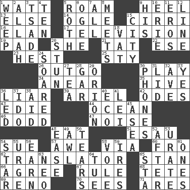 ACROSS 1. Electrical Unit 5. Wander 9. The bottom of a shoe or boot 13. Otherwise 14. Stare at amorously 15. High-altitude cloud 16. Enthusiasm 17. Boob tube 19. Writing tablet 20. A female animal or person 21. Make lace 22. Compass dir. 23. Behest 25. Filthy place 26. Money paid out 30. Live dramatic performance 34. Approach 35. Hub of activity 36. One who doesn't tell the truth 39. Satellite of Uranus 42. Lyric poems 43. Singer Brickell 44. Sea 46. Texas town _ City 47. Annoying sound 48. Consume 51. Son of Isaac 54. Take to court 57. Deep reverence 58. By way of 60. From 62. Interpreter 65. Comedian Laurel of Laurel & Hardy 66. Match 67. General guideline 68. False hair 69. Former U.S. Attorney General Janet 70. Perceives with the eye 71. Ancient Greek god of war DOWN 1. Shed a tear 2. Assad's deity 3. Sadhe (variant) 4. "___ Little Indians" 5. Writer of Portnoy's Complaint (1969) 6. Double curve, resembling the letter S 7. 100% 8. Confronts 9. Part of HMS, perhaps 10. One of the Great Lakes 11. Greek god of love 12. Actor's bit 15. Municipality 18. Large container 20. Astound 24. Flew 27. Beverage made from leaves 28. Slender fish 29. Constellation of myth 30. Gives a jingle 31. Flaplike covering 32. "___ Maria" 33. Consenting reply 36. Directed 37. Wedding promise 38. Assist 40. Environmental prefix 41. Flowery wreath 45. Toward the sea 48. Relaxation 49. Leather borer 50. Pulls apart 52. Following 53. A salt of uric acid 54. Play the lead 55. Goad 56. Merit 58. Grand slam 59. Angers 61. Washington bills 63. Modern: prefix 64. Third day of the wk. 65. R.R. building