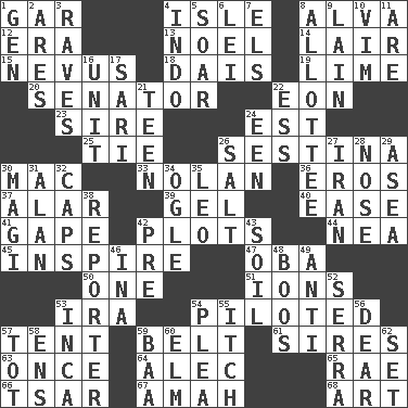 ACROSS 1. Slender fish 4. Capri or Wight 8. Inventor's middle name 12. Period 13. Christmas carol 14. Den 15. Mole, birthmark 18. Raised platform 19. Citrus frut 20. Legislator 22. A really long time 23. Title for a man of rank and authority 24. Eastern Standard Time (abbr.) 25. Make a knot 26. French poetic form 30. Big _ 33. Pitcher Ryan 36. Greek god of love 37. Having or resembling wings 39. Set 40. Comfort 41. Yawn 42. Graphs 44. Teachers' org. 45. Stimulate to action 47. Chief or king in Benin or Nigeria 50. Single 51. Charged particles 53. Lyricist Gershwin 54. Manned the helm 57. Portable shelter 59. Waist strap 61. Male parents of animals 63. At one time in the past 64. Actor Baldwin 65. Actress Charlotte 66. Russian ruler of old 67. Wet nurse 68. Tate display DOWN 1. Commissioned military rank (abbr.) 2. Ancient Greek god of war 3. All-night dance parties 4. Southeast Asian peninsula 5. Fly high 6. Flowery wreath 7. Raised railways 8. One to whom something is allotted 9. (Had) reclined 10. Zeal 11. "We ___ not amused" (Victoria) 16. A single undivided whole 17. Indian skirt 21. Adolescent 22. Double-curved letter 24. Car or cant ending 26. Table seasoning 27. SW Asia republic 28. Characteristic smell of wine 29. At sea 30. Wise men 31. ____ Jay Lerner 32. Balmoral and tarboosh 34. Stare at amorously 35. Lion 38. Newsperson 42. Before (prefix) 43. The visible part of the earth's surface 46. _ tizzy (2 wds.) 48. Scornful sounds 49. Opposed to 52. Spanish missionary in California 53. South American Indian 54. Entreaty 55. Hankering 56. Letter starter 57. Small child 58. Followers of ems 59. Sound made by sheep 60. Shade tree 62. Arrange properly for use