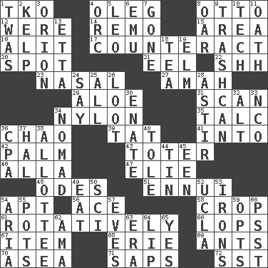 ACROSS 1. Ring climax 4. Cassini of fashion 8. Von Bismarck 12. We are 14. San ____ (Riviera town) 15. Type of rug 16. Set down 17. Frustrate 20. Blemish 21. Snakelike fish 22. Quiet! 23. Rhinal 27. Housemaid 29. Medicinal plant 31. Skim 34. High-strength synthetic material 35. Baby powder 36. US Secretary of Labor Elaine L. _ 39. Make lace 41. To the inside or interior of 42. Inside of hand 43. Carrier 46. Silent film actress Nazimova 47. Writer Wiesel 48. Lyric poems 51. World-weariness 54. Fitting 56. Adept person 58. Riding implement 61. Happening in regular succession 66. Chops off 67. A whole individual unit 68. One of the Great Lakes 69. Pismires 70. Toward the sea 71. Plant excrements 72. Fast jet (abbr.) DOWN 1. It was, poetically 2. Seaweed 3. Constellation of myth 4. The grampus (Milton) 5. Lion 6. Australian flightless bird 7. Went 8. Boat paddle 9. File 13 10. Technology 11. Pledge 13. Singer James 18. Afternoon social gathering 19. Shade tree 24. Declare 25. 100% 26. Plunder 28. Moving or stirring 30. Maternal 32. Keyboard modifier key 33. Non-commissioned officer (abbr.) 34. Wanderer 36. Accounting whiz (abbr.) 37. Actor Linden 38. One to whom something is allotted 40. Lacquered or enameled metalware 44. Metal container 45. Car or cant ending 49. Ingest 50. _-fi 52. Southern CA. univ. 53. Removes the wrinkles 54. Operatic vocal solo 55. Plant holders 57. Nights before holidays 59. Chooses 60. Inconspicuous attention getter 62. Nanny (var.) 63. Period 64. Mouth edge 65. It is so