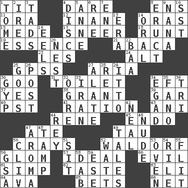 ACROSS 1. Teat (slang) 4. Have the gumption 8. Followers of ems 11. Mouth or opening 12. Empty; void 14. Mouths or openings 15. Ancient Persian 17. Contemptuous expression 18. The smallest animal of a litter 19. Gist 21. Phillipine bananalike plant 23. French article 24. The first octave above the treble staff 25. Global Positioning Systems (abbr.) 27. Roberta Peters solo 30. Thick or sticky substance 31. Rest room 34. Newt 37. It is so 38. Monetary aid 39. Slender fish 40. Pacific Standard Time (abbr.) 41. Food allowance for one day 43. Cuckoo 44. French philosopher Descartes 45. Inside; within (prefix) 47. Had dinner 49. The 19th letter of the Greek alphabet 50. Trading vessels 52. Apple salad 56. Take by theft 57. Standard of perfection 60. Tending to cause great harm 61. Simple or foolish person 62. Clothes sense 63. Connecticut Ivy Leaguer 64. Actress Gardner 65. Stakes 66. Remaining after all deductions DOWN 1. Heavy book 2. Angers 3. Bits 4. Plates 5. Singer Murray 6. Actress Charlotte 7. Compass dir. 8. Spew [out] 9. Nanny 10. Fast jet (abbr.) 13. Epoch 14. Spoken 16. Snakelike fish 20. Egg locale 22. Sound made by sheep 25. Moves 26. Mail 27. Having winglike extensions 28. Painter Guido (1575-1642) 29. "Tell ____ the Marines!" 30. Flimflam 32. Legendary monster 33. SW Asia republic 34. Mild oath 35. Papal veil 36. Three (prefix) 42. Anneal 44. Marina Del _, California 46. Naked 47. Odor 48. Pack (down) 49. Falsehoods 50. 154 in Roman numerals 51. Be seated 52. Electrical Unit 53. Baking chamber 54. Cause heat under the collar 55. Secret move to avoid paying debts 56. Girls' org. (abbr.) 58. Apply (a substance) by light strokes 59. Compass dir.