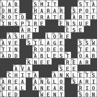 ACROSS 1. Experiment locale 4. Stricken, poetically 8. R.R. building 11. Single 12. Ethiopian city, capital of Harari 14. Blemish 15. Printing process, for short 17. Feeling or showing extreme anger 18. Johnson of "Laugh-In" 19. Motivate 21. Follow as a consequence or result 23. Nonscientific branch of learning 24. Compass dir. 25. American tennis player Robert 27. Old wives' tales, e.g. 30. "___ Maria" 31. Fodder prepared in a silo 34. Compass dir. 37. Metal container 38. Cowboy competition 39. Afternoon social gathering 40. Increase 41. Most capable 43. Rowing implement 44. Leg joint 45. Posterior 47. Actress Gardner 49. Perceive with the eye 50. Riviera of "Kiss of the Spider Woman" 52. Short socks 56. Length times width 57. White American of non-Hispanic descent 60. Indian skirt 61. Welt 62. Approach 63. _ de Janeiro 64. Directed 65. Left 66. Male child DOWN 1. Australian parrot (variant) 2. At once, immediately (arch.) 3. Antes 4. Upper-body garment 5. Female horse 6. Retirement account (abbr.) 7. Make lace 8. Upset 9. Lug 10. Had dinner 13. To separate or throw off 14. Backtalk 16. Brightly colored fish 20. Angers 22. Born 25. Enthusiastic 26. Post 27. Dipping utensil 28. Double curve, resembling the letter S 29. Vintage cars 30. _ moment's notice (2 wds.) 32. SW Asia republic 33. Ear part 34. Portico 35. Shrivel 36. Armed conflict 42. Long journey 44. Krazy ___ of comics 46. Snakelike fish 47. Forward in time 48. Small bottle 49. Derisive sound 50. Algonquian 51. Auto club (abbr.) 52. Actor Alda or Thicke 53. Hearing organs 54. Musical group of three 55. The Jewish people; Israel 56. Leather borer 58. Compass dir. 59. Turn to the right