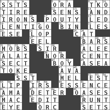 ACROSS 1. Fast planes 5. Mouth or opening 8. Ring climax 11. Become fatigued 12. Elected reps. 14. Plus 15. Removes the wrinkles 17. Marked by pouting 18. Directed 19. Small, flat, pigmented spot on the skin 21. Storage container 22. French article 23. Compass dir. 24. Trim (branches) 25. Feline 27. Snakelike fish 28. Taverns 31. Disorderly crowds 35. Title for a knight 37. Toward shelter 38. Jai ____ 39. And not 41. Penny 42. Religious group 43. Male child 45. At sea 46. Puff or smoke 47. Actress Gardner 49. Fast jet (abbr.) 51. Cartoonist voice _ Blanc 52. Eastern Standard Time (abbr.) 55. Mouth edge 57. Big collection agency 60. Substance 62. Wet nurse (var.) 63. Prevent from occurring 65. Fertile tracts in a desert 66. Big _ 67. Prepare for publication 68. The smallest animal of a litter 69. Sight organ 70. The grampus (Milton) 71. Puts into a specified state DOWN 1. Vertical member of a panel or frame 2. Fathers 3. Marketplace scale 4. Posted 5. Bear (Spanish) 6. Reuben's nickname 7. Against 8. Baron Munchausen's specialties 9. Leg joint 10. Likelihood 13. Synchronize (abbr.) 16. Filth; sediment 17. Cotton for raincoats, e.g. 20. Travels 26. Phillipine bananalike plant 29. French philosopher Descartes 30. Stalk of a moss capsule 31. Vertical spar for supporting sails 32. Margarine 33. Keyboard key 34. Locates 36. Director Reiner 40. Nomad 44. Jacques Cousteau's middle name 48. In addition 50. Periodic rise and fall of the sea level 52. Follow as a consequence or result 53. Odor 54. Trials 55. Unable to walk 56. "If ____ say so..." 58. Make new 59. Disorderly outburst 61. Hearing organs 64. And so on (abbr.)