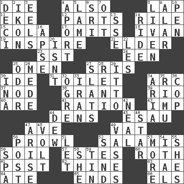 ACROSS 1. Pass on 4. In addition 8. Infant locale 11. Make supply last 12. Actors' quests 14. Cause heat under the collar 15. Root beer relative 17. Leaves out 18. _ the terrible 19. Heighten or intensify 21. A person who is older than you are 23. Fast jet (abbr.) 24. Car or cant ending 25. Sign of something about to happen 27. Indian titles of respect 30. Binary compound 31. Bathroom plumbing fixture 34. Curve 37. Lower and raise head in agreement 38. Let have 39. River (Sp.) 40. "We ___ not amused" (Victoria) 41. Food allowance for one day 43. Naughty child 44. Cub Scout units 45. Son of Isaac 47. "___ Maria" 49. Large container 50. Move like a hungry wolf 52. Deli grouping 56. The visible part of the earth's surface 57. _____ Park, CO 60. Writer of Portnoy's Complaint (1969) 61. Inconspicuous attention getter 62. One or ones belonging to thee 63. Actress Charlotte 64. Had dinner 65. Conclusions 66. Raised railways DOWN 1. Tenth: prefix 2. Picture 3. Snakelike fish 4. To the left, to Queeg 5. Unable to walk 6. Indian title of respect (Mr.) 7. Baseball player Mel 8. Make or become more lively 9. Having or resembling wings 10. Animal enclosure 13. Compass dir. 14. Travel on or in a vehicle 16. Domed church section 20. Is not 22. French article 25. Aroma 26. Ancient Persian 27. Narrow boards 28. Painter Guido (1575-1642) 29. "Tell ____ the Marines!" 30. _ tizzy (2 wds.) 32. Legendary monster 33. SW Asia republic 34. Roberta Peters solo 35. Tall New Zealand timber tree 36. Police officer (slang) 42. Anneal 44. Morning condensation 46. Play the lead 47. Originate 48. Electrical Unit 49. Flower holders 50. Mail 51. Allow 52. Post 53. Greater amount 54. Slanted text style (abbr.) 55. "______ My Girl" (Turtles hit) 56. Health resort 58. A female animal or person 59. Shallow baking pan
