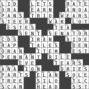 ACROSS 1. Flaplike covering 4. Allows 8. Pace 12. Mouth or opening 13. Merit 14. Small Philippine buffalo 15. Zero-star reviews 17. Musical group of three 18. Erodes 19. Bull 21. Armed conflict 23. Car dealer's back yard 24. _____ Park, CO 26. Afternoon social gathering 28. Posted 30. Elected representative 34. Music discs 37. SW Asia republic 39. Assistant 40. Hit sharply and swiftly 41. Stories 43. Lair 44. NW Algerian seaport 46. Detail 47. Eastern Standard Time (abbr.) 48. Pre-World Series prize 51. Cause heat under the collar 54. First lady 55. Pulls into pieces 58. Santa ___, CA 61. Electrically charged atom 63. Frees from moisture 65. Components 67. Style 71. Flatfish 72. Relationship diagram 73. Grain storage tower 74. Affectionate concern, for short 75. Examine minutely or intensely 76. Froth on beer 77. Fast jet (abbr.) DOWN 1. Chops off 2. Feeling or showing extreme anger 3. Natives or inhabitants of Denmark 4. Allow 5. Ewer handle 6. Three (prefix) 7. Frozen precipitation 8. Actress Charlotte 9. Of or related to the anus 10. "Corrida" creature 11. Compass direction 16. Puts into a specified state 18. Songbird 20. To riddle 22. Had dinner 25. In a ____ (agitated or irritated) 27. American Automobile Association (abbr.) 29. Distinguishing feature 30. Contemptuous expression 31. Event that recurs at intervals 32. Lyric poems 33. Monthly bill 34. Riding implement 35. Have the gumption 36. Connect, as a bridge 38. The first octave above the treble staff 42. Stricken, poetically 45. Compass dir. 49. Opinion 50. Modern: prefix 52. Directed 53. Hearing organs 56. Debaucheries 57. Makes a sale 58. Tenement units (abbr.) 59. Drug cop 60. Type of rug 62. Delicate 64. Religious group 66. Nine, plus one 68. Untruth 69. Wing 70. Allow head to fall sleepily