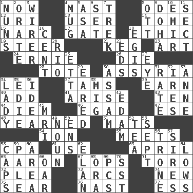 ACROSS 1. At this time 4. Vertical spar for supporting sails 8. Lyric poems 12. RI univ. 13. One who makes use of a thing 14. Heavy book 15. Drug cop 17. Yard entry 18. Principle of right and wrong 19. Navigate 21. Cask 23. Nonscientific branch of learning 24. Bert's buddy 26. Expire 28. Carry 30. Nineveh was its capital 34. Flowery wreath 37. Scottish caps 39. Merit 40. Increase 41. Get up 43. Nine, plus one 44. South Vietnam president (1954) 46. Mild oath 47. Compass dir. 48. Had a strong desire 51. Floor protectors 54. Electrically charged atom 55. Confronts 58. Accounting whiz (abbr.) 61. Purpose 63. Showery time 65. Composer Copland 67. Chops off 71. "Corrida" creature 72. Entreaty 73. Curves 74. ___ Haven, CT 75. Dry up 76. Political cartoonist Thomas 77. Double-curved letter DOWN 1. Religious women 2. Speak pompously 3. One who wires 4. Large cup 5. White ___ sheet 6. Put into a specified state 7. Long journey 8. Baseball player Mel 9. Capital of the state of Qatar 10. Arab leader 11. Religious group 16. Penny 18. The front part of a cuirass 20. _ de Janeiro 22. Begley and Asner 25. Singer James 27. Sight organ 29. Having ears or earlike features 30. Indian state 31. Assign a rank or rating to 32. Angers 33. Queen of England 1702-14 34. Kenny Rogers chart-topper in '80 35. Singer Brickell 36. The content of cognition 38. Russian fighter aircraft 42. Dutch treat 45. Medical imaging device (abbr.) 49. Part of speech 50. Followers of ems 52. Afternoon social gathering 53. Back-to-school mo. 56. Heavy duty weighing machine 57. Founders of families 58. Balmoral and tarboosh 59. Diluted with white 60. Type of rug 62. Enthusiasm 64. Coldest temperatures 66. Boat paddle 68. Mouth or opening 69. Personal Computers (abbr.) 70. Fast jet (abbr.)