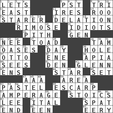 ACROSS 1. Allows 5. Pacific Standard Time (abbr.) 8. Three (prefix) 11. Compass direction 12. Angers 13. Friend of Pooh 14. A viewer who gazes fixedly 17. Accusation by an informer 19. Full of chinks, cracks, or crevices 21. Foolish or stupid persons 22. Heart or essence 23. Commissioned military rank (abbr.) 24. Born 27. Frog relative 29. Scottish cap 32. Fertile tracts in a desert 34. 24 hours 36. Hollow 37. Von Bismarck 38. Compass dir. 39. Capital of Western Samoa 40. Observes 41. Lair 42. American astronaut and politician John 43. Followers of ems 44. Play the lead 46. Put into a specified state 47. American Automobile Association (abbr.) 50. Length times width 52. Soft color 55. Fortification 57. Electrical Measurement 59. Unemotional ones 62. Area sheltered from the wind 63. Slanted text style (abbr.) 64. Argument over a trivial matter 65. Conclusion 66. Car or cant ending 67. Suggestive of the supernatural DOWN 1. French article 2. Ingest 3. Russian ruler of old 4. Remove all contents or possession from 5. Before (prefix) 6. Former Milwaukee Brewers owner Bud 7. Sadhe (variant) 8. Musical group of three 9. Carrot, for example 10. Charged atoms 12. Binary compound 15. Sends forth 16. Printing process, for short 18. Metal container 20. Cast a shadow over 24. Trap for birds or small mammals 25. Eroded 26. _____ Park, CO 28. Natives or inhabitants of Denmark 29. Drinks excessively 30. Place in a line 31. Intended 33. Greek goddess of the dawn 35. Gossips 36. Actor Linden 42. Relatively large 45. Curves 47. Had dinner 48. Nest on high 49. Having winglike extensions 51. Came up 52. Diluted with white 53. So be it 54. Moved rapidly 55. Snakelike fish 56. Corncob 58. Separate the seeds from cotton 60. 4-wheeled motor vehicle 61. Filthy place