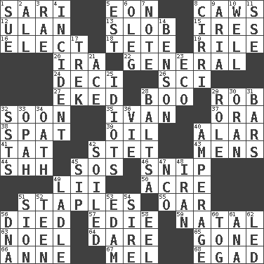 ACROSS 1. Indian skirt 5. Period of immesurable duration 8. Crow sounds 12. ____ Bator 13. Oscar Madison type 15. Angers 16. Opt 18. False hair 19. Cause heat under the collar 20. Retirement account (abbr.) 22. Commissioned military rank 24. Tenth: prefix 26. _-fi 27. Supplemented with great effort 28. Sometimes accompanies a hiss 29. Director Reiner 32. Within a short period 35. _ the terrible 37. Mouth or opening 38. Argument over a trivial matter 39. Lubricate 40. Having or resembling wings 41. Make lace 42. Proofreading order 43. Not women's 44. Quiet! 45. Mayday 46. Clip 49. Cards in a Roman deck? 50. Land measure 51. Paper fasteners 55. Boat paddle 56. Passed on 57. Singer Brickell 59. Relating to or accompanying birth 63. Christmas carol 64. Have the gumption 65. Went 66. Singer Murray 67. Cartoonist voice _ Blanc 68. Mild oath DOWN 1. Take to court 2. 100% 3. Actress Charlotte 4. Event 5. Eastern Standard Time (abbr.) 6. Cassini of fashion 7. Short letter 8. High-altitude cloud 9. Operatic vocal solo 10. Water source 11. Compass dir. 14. Gillaume's butler role 17. Long journey 21. Adept person 23. Environmental prefix 25. Foolish or stupid persons 28. Greek mezzo-soprano Agnes 29. Hero or heavy, e.g. 30. NW Algerian seaport 31. Oblong pieces of solid material 32. Fast planes 33. Brightly colored fish 34. Pledge 36. Compete 40. Electrical Measurement 42. Dirtied 45. Small drink 47. Non-commissioned officer (abbr.) 48. SW Asia republic 49. Dipping utensil 51. The Jewish people; Israel 52. Adolescent 53. Dutch treat 54. Title for a man of rank and authority 56. Heredity factor (abbr.) 58. Snakelike fish 60. Coat; cloak 61. Santa ___, CA 62. Directed