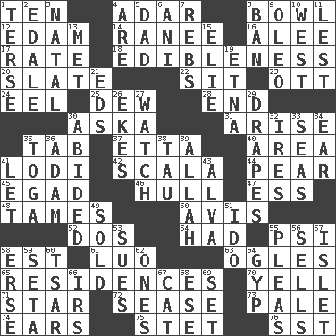 ACROSS 1. "___ Little Indians" 4. The sixth month of the Jewish calendar 8. Soup holder 12. Dutch treat 14. The wife of a rajah (variant) 16. Toward shelter 17. Pace 18. The property of being fit to eat 20. Chalkboard 22. Be seated 23. Baseball player Mel 24. Snakelike fish 25. Morning condensation 28. Conclude 30. "____ silly question..." 31. Get up 35. Bar bill 37. Singer James 40. Length times width 41. Farming town in central California 42. Any of the three canals of the cochlea 44. Lightbulb-shaped fruit 45. Mild oath 46. Frame or body of a ship 47. Curvy letter 48. Softens 50. Advice 52. Two (Sp.) 54. Possessed 55. Air pressure measure (abbr.) 58. Eastern Standard Time (abbr.) 61. Nilotic language 63. Stares 65. Dwellings 70. Shout 71. Play the lead 72. Gospel singer Marvin 73. Light colored 74. Hearing organs 75. Proofreading order 76. Fast jet (abbr.) DOWN 1. Laconic 2. Peak District village in England 3. Brizilian seaport 4. "We ___ not amused" (Victoria) 5. Male parent 6. Cuckoo 7. Confederate soldiers (slang) 8. Prohibit 9. Butter sub 10. Compass direction 11. For fear that 13. Was introduced to 15. Writer Wiesel 19. Inactive volcano in Sicily 21. Begley and Asner 26. Makes supply last 27. Timepiece 29. Window treatments 30. Remained 32. Angers 33. Oceans 34. Ewer handle 35. Ancient Roman robe 36. First of billions? 38. The 19th letter of the Greek alphabet 39. Assad's deity 41. Allow 43. Inventor's middle name 49. Exchanged or delivered for money 51. Wedding promise 53. Institutes legal proceedings 55. Entreaties 56. Makes a sale 57. Small island 58. Celtic language 59. Bristle 60. Russian ruler of old 62. Washington bills 64. Swindle 66. Big collection agency 67. Feline 68. Compass dir. 69. Put into a specified state