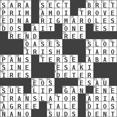 ACROSS 1. "Two Mules for Sister ____" 5. Religious group 9. Cy Young winner Saberhagen 13. Demure 14. Mine, in Marseilles 15. Collection of objects 16. Pulitzer Prize-winning author Ferber 17. Complicated, petty procedures 19. Two (Sp.) 20. Small island 21. Single 22. Eastern Standard Time (abbr.) 23. Tear apart 25. To sift 26. Fertile tracts in a desert 30. Groove 34. From or relating to Ireland 35. Edible starchy tuberous root 36. Zero-star reviews 39. Laconic 42. Blind as ____ 43. Trig term 44. 1973 Nobel Price Winner (Physics) Leo 46. Angers 47. Prevent from occurring 48. Greek goddess of the dawn 51. Son of Isaac 54. Institute legal proceedings 57. Mouth edge 58. Separate the seeds from cotton 60. Compass dir. 62. Interpreter 65. Operatic vocal solo 66. Match 67. Falsehood 68. "Vaya con ____" 69. Billionth: prefix 70. Beer foam 71. Gouge DOWN 1. Hurried 2. Zeal 3. Remove soap 4. Wet nurse (var.) 5. Indian skirt 6. Give off 7. Gear tooth 8. Southeast Indonesia island 9. Sis' sibling 10. Hero or heavy, e.g. 11. Nights before holidays 12. Trial 15. Family _ (genealogy) 18. One (Scot) 20. The sixth month of the Jewish calendar 24. Annoying sounds 27. Be seated 28. Compass dir. 29. Fragment 30. Flight of steps 31. Experiment locale 32. Mouth or opening 33. Small child 36. 23rd letter of the Greek alphabet 37. Wind 38. Compass dir. 40. Compass dir. 41. Erode 45. Peachy ____! 48. Otherwise 49. Petroleum 50. Arguments over trivial matters 52. Nest on high 53. The state of being joined or united 54. Comedian Laurel of Laurel & Hardy 55. Capital and largest city of Mongolia 56. Merit 58. Gilt 59. Ancient Greek god of war 61. Compass direction 63. Modern: prefix 64. The 19th letter of the Greek alphabet 65. Find the sum of