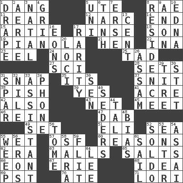 ACROSS 1. Mild oath, euphamism for damn 5. Shoshoni 8. Actress Charlotte 11. Tail end 12. Drug cop 14. Conclusion 15. Nick name for Arthur 17. Wash lightly 18. Male child 19. Player piano 21. Layer 22. _ tizzy (2 wds.) 23. Snakelike fish 24. Not either 25. Small amount or degree 27. _-fi 28. Puts into a specified state 31. Fastener 35. It is 37. In a ____ (agitated or irritated) 38. Expression of disdain 39. It is so 41. 1/640 square mile 42. In addition 43. Fish or hair follower 45. Confront 46. It's straight from the horse's mouth 47. Apply (a substance) by light strokes 49. Arrange properly for use 51. Biblical high priest 52. Ocean 55. Dripping 57. Order of Saint Francis (abbr.) 60. Thinks logically 62. Period 63. Promenades 65. Table seasonings 66. A really long time 67. One of the Great Lakes 68. It may be bright or harebrained 69. Pacific Standard Time (abbr.) 70. Had dinner 71. Australian parrot (variant) DOWN 1. Window treatment 2. Nest on high 3. Brizilian seaport 4. Smile widely 5. University (slang) 6. Hyperbolic tangent 7. Celtic language 8. Home 9. At once, immediately (arch.) 10. Pulitzer Prize-winning author Ferber 13. Penny 16. Immeasurably long periods of time 17. Noteworthy scarcity 20. Event scenes 26. Indian state 29. Become fatigued 30. Proofreading order 31. Practice fight 32. Mediterranean tributary 33. Helper 34. Give a jingle 36. Elected rep. 40. Spring feasts 44. Story 48. Prejudice 50. Heavy book 52. Twentieth part of a lira 53. Keyboard key 54. Slender Brazilian palm 55. Shed a tear 56. Greek god of love 58. "Two Mules for Sister ____" 59. Sudden quick movement 61. Travel by water 64. Area sheltered from the wind