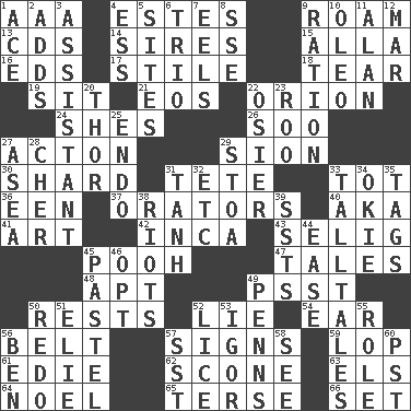 ACROSS 1. Auto club (abbr.) 4. _____ Park, CO 9. Wander 13. Music discs 14. Male parents of animals 15. Silent film actress Nazimova 16. Begley and Asner 17. Vertical member of a panel or frame 18. Pull apart 19. Be seated 21. Greek goddess of the dawn 22. Constellation of myth 24. "______ My Girl" (Turtles hit) 26. "Barney Miller" actor Jack 27. 13-14th century defensive garment 29. The Jewish people; Israel 30. Broken piece 31. False hair 33. Small child 36. Car or cant ending 37. Speakers 40. Alias (abbr.) 41. Nonscientific branch of learning 42. South American Indian 43. Former Milwaukee Brewers owner Bud 45. "Silly old bear" 47. Stories 48. Fitting 49. Inconspicuous attention getter 50. Musical pauses 52. Whopper 54. Hearing organ 56. Waist strap 57. Public displays of written messages 59. Chop off 61. Singer Brickell 62. Biscuitlike quick bread 63. Raised railways 64. Christmas carol 65. Laconic 66. Arrange properly for use DOWN 1. Adept person 2. Sums up 3. Helper 4. Double-curved letter 5. Settings 6. Musical group of three 7. Snakelike fish 8. Compass dir. 9. Food allowance for one day 10. Butter sub 11. Actor Alda or Thicke 12. Impair 20. Son of Odin 22. Flexible twig of a willow tree 23. Friend of Pooh 25. Inside; within (prefix) 27. At sea 28. "Mermaids" star 29. Portico 31. Hyperbolic tangent 32. And so on (abbr.) 33. Baron Munchausen's specialties 34. Migrant worker of the '30s 35. Labels 38. Debaucheries 39. Fast planes 44. Relaxation 45. Soft color 46. Choose 49. Actor Sean's family 50. Make new 51. Writer Wiesel 52. Louse (plural) 53. Composer Stravinsky 55. Hero or heavy, e.g. 56. Benjamin's nick name 57. Fast jet (abbr.) 58. Perceive with the eye 60. Pacific Standard Time (abbr.)