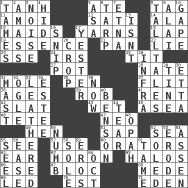 ACROSS 1. Hyperbolic tangent 5. Had dinner 8. Label 11. Mine, in Marseilles 12. Suttee (variant) 14. According to 15. Women servants 17. Tall tales 18. Pet locale 19. Gist 21. Baking dish 22. Whopper 23. Compass dir. 24. Big collection agency 25. Teat (slang) 27. Plant holder 28. Nathan's nickname 31. Undercover agent 35. Writing instrument 37. Sudden quick movement 38. Eras 39. Director Reiner 41. Monthly bill 42. Narrow board 43. Dripping 45. Toward the sea 46. Wig 47. Modern: prefix 49. Layer 51. Plant excrement 52. Ocean 55. Observe 57. Purpose 60. Speakers 62. Ewer handle 63. Person of subnormal intelligence 65. Radiant circles of light 66. Compass dir. 67. Coalition 68. Ancient Persian 69. Directed 70. Eastern Standard Time (abbr.) 71. Locale of original sin DOWN 1. Corrects by punishment or discipline 2. Collect or gather 3. Annoying sound 4. Flintstone garb 5. White ___ sheet 6. Canvas cover 7. Inactive volcano in Sicily 8. Baron Munchausen's specialties 9. Mountain range southwest of Kyrgyzstan 10. Open wide 13. Is not 16. Sever or remove by pinching or nipping 17. Of or pertaining to yesterday 20. Riding implement 26. Kind of red light 29. Prong on a fork 30. Singer James 31. Vertical spar for supporting sails 32. Stare at amorously 33. Tough but pliablecoriaceous 34. First name in cosmetics 36. At this time 40. Gillaume's butler role 44. Pull into pieces 48. Brightly colored fish 50. Unfeeling 52. Having a sole or soles 53. Wear away 54. NE Netherlands city 55. Sew up the eyelids of hawks and falcons 56. Relaxation 58. Flatfish 59. Greek god of love 61. Docile 64. Sep. follower
