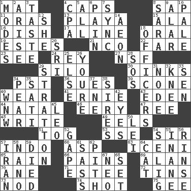 ACROSS 1. Floor covering 4. Balmoral and tarboosh 8. Plant excrement 11. Mouths or openings 13. Beach, in Buenos Aires 15. According to 16. Food container 17. Place in a line 18. Spoken 19. _____ Park, CO 21. Non-commissioned officer (abbr.) 22. Conductor's collection 23. Observe 24. Marina Del _, California 27. Overdraft (abbr.) 29. Grain storage tower 30. Pig sounds 34. Pacific Standard Time (abbr.) 36. Institutes legal proceedings 39. Biscuitlike quick bread 40. Erode 41. Bert's buddy 43. Locale of original sin 44. Relating to or accompanying birth 46. Suggestive of the supernatural 47. Portuguese money of account (variant) 48. Compose 49. Snakelike fish 51. Coat; cloak 53. Compass dir. 54. Title for a knight 57. Southeast Asian peninsula 60. Cleo's killer 63. Ancient Celtic tribe of eastern Britain 65. Precipitation 66. Aches 69. ____ Jay Lerner 70. A saturated hydrocarbon 71. First name in cosmetics 72. Airtight sealed metal containers 73. Allow head to fall sleepily 74. Went for two points 75. Turn to the right DOWN 1. Methods 2. Ascend 3. Clothes sense 4. Numbers guy (abbr.) 5. 100% 6. Ache 7. Synchronize (abbr.) 8. "Two Mules for Sister ____" 9. Having or resembling wings 10. Light colored 12. A female animal or person 14. Period of immesurable duration 18. Persons of authority 20. _ Lanka 25. Otherwise 26. You are 28. Distress signal 29. Ski resort town in Vermont 31. Connecting point 32. Leg joint 33. Elected rep. 34. Lightbulb-shaped fruit 35. Suttee (variant) 37. Compass dir. 38. Begets 40. Compass dir. 42. Snake ____ (dice throw) 45. Lion 50. Flowery wreath 52. Open wide 54. Former Milwaukee Brewers owner Bud 55. Empty; void 56. Remove soap 57. SW Asia republic 58. Billionth: prefix 59. Passed on 61. Backtalk 62. Heart or essence 64. Domesticated feline 67. Modern: prefix 68. Arrange properly for use