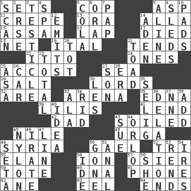 ACROSS 1. Puts into a specified state 5. Police officer (slang) 8. Cleo's killer 11. Streamer paper 13. Mouth or opening 14. Silent film actress Nazimova 15. Indian state 16. Infant locale 17. Passed on 18. Remaining after all deductions 19. Slanted text style (abbr.) 21. Is inclined (to) 22. "Tell ____ the Marines!" 24. Singles 25. Buttonhole 27. Ocean 29. Table seasoning 30. Nobles 32. Type of rug 33. Sports stadium 35. Pulitzer Prize-winning author Ferber 39. Ms. Damita and namesakes 41. Grant temporary use of 42. Male parent 43. Dirtied 45. "Death on the ____" 48. Capital and largest city of Mongolia 49. Damascus' land 50. Highlander 52. Three (prefix) 55. Liveliness 56. Electrically charged atom 57. Flexible twig of a willow tree 59. Lug 60. Heredity factor (abbr.) 61. Give a jingle 62. A saturated hydrocarbon 63. Snakelike fish 64. Extremities DOWN 1. Examine minutely or intensely 2. Celtic language 3. A testis 4. Health resort 5. Root beer relative 6. Taken by mouth 7. Infant food 8. Place in a line 9. Bobsleighs 10. Writing tablets 12. Gives off 14. An important port of Yemen 20. Small child 21. Frog relative 23. "_____ Recall" 25. White ___ sheet 26. Auto 27. Male offspring 28. Period 30. French article 31. Former Milwaukee Brewers owner Bud 33. According to 34. To free from 36. Accusation by an informer 37. Compass dir. 38. Say or write further 40. It may be bright or harebrained 43. Institute legal proceedings 44. Lowest deck of a ship 45. Thermoplastic polyamide 46. Feeling or showing extreme anger 47. Actor's bit 49. Bristle 50. Went 51. Of or related to the anus 53. Tear apart 54. Angers 56. Binary compound 58. A female animal or person