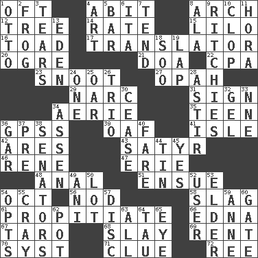 ACROSS 1. Often (poetically) 4. "This won't hurt ____!" 8. Bowlike part 12. Family _ (genealogy) 14. Assign a rank or rating to 15. _ and Stitch 16. Frog relative 17. Interpreter 20. Legendary monster 21. ___ good deed 22. Accounting whiz (abbr.) 23. Snob 27. Brightly colored fish 29. Drug cop 31. Signal 34. Nest on high 35. Adolescent 36. Global Positioning Systems (abbr.) 39. Clumsy lout 41. Small island 42. Ancient Greek god of war 43. Letch 46. French philosopher Descartes 47. One of the Great Lakes 48. Of or related to the anus 51. Follow as a consequence or result 54. Sep. follower 56. Lower and raise head in agreement 58. Volcanic refuse 61. Appease 66. Pulitzer Prize-winning author Ferber 67. Pacific island yam 68. Kill 69. Monthly bill 70. System (abbr.) 71. A slight indication 72. To sift DOWN 1. "Beetle Bailey" pooch 2. Toadlike animal 3. Lacerates 4. Nonscientific branch of learning 5. Drinking establishment 6. Call ___ day 7. Watch over 8. Insect wing 9. Actors Guy, Robert Welles, and Clint 10. Hoof sound 11. Israeli folk dance 13. Paradise 18. "Barney Miller" actor Jack 19. Pet locale 24. Single 25. Boat paddle 26. Musical group of three 28. Moving or stirring 30. Desist 32. Set 33. Compass dir. 34. NE Netherlands city 36. Slender fish 37. Before (prefix) 38. Legislators 40. Conductor's collection 44. Shallow baking pan 45. It is so 49. Black tropical American cuckoo 50. Car dealer's back yard 52. One who makes use of a thing 53. A person who is older than you are 54. Chooses 55. Supercomputer manufacturer 57. Flat circle 59. Singer Murray 60. Yard entry 62. Plant holder 63. 100% 64. The 19th letter of the Greek alphabet 65. Sight organ