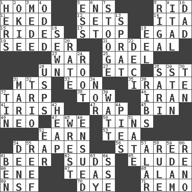 ACROSS 1. Like (prefix) 5. Followers of ems 8. To free from 11. Supplemented with great effort 12. Arranges properly for use 14. Call ___ day 15. Amusement-park features 17. Constrict 18. Mild oath 19. Sowing specialist 21. Severe or trying experience 23. Armed conflict 25. Highlander 26. To (old English) 27. And so on (abbr.) 28. Fast jet (abbr.) 31. Mountains (abbr.) 33. Period of immesurable duration 35. Feeling or showing extreme anger 37. Canvas cover 38. Pull behind 40. SW Asia republic 41. From or relating to Ireland 43. Hit sharply and swiftly 45. Storage container 46. Modern: prefix 47. She-sheep 50. Metal containers 52. Merit 53. Afternoon social gathering 54. Window treatments 56. A viewer who gazes fixedly 61. Fermented drink made from hops 62. Beer foam 65. Dodge 66. Compass dir. 67. Beverages made from leaves 68. Actor Alda or Thicke 69. Science/research agcy. 70. Color 71. San ____ (Riviera town) DOWN 1. Possessive pronoun 2. Migrant worker of the '30s 3. Ancient Persian 4. Wrote a lyric poem 5. Double-curved letter 6. Remaining after all deductions 7. Moe Howard, for one 8. Capital of Latvia 9. Slanted text style (abbr.) 10. Male parent 13. Small fatty European fish 16. Stitched 18. Snakelike fish 20. Assign a rank or rating to 22. Tenth: prefix 24. Carrot, for example 26. United States Postal Service (abbr.) 28. Indian skirt 29. Comedian Laurel of Laurel & Hardy 30. "___ Little Indians" 31. Female horse 32. Musical group of three 34. Not either 36. Teases 37. Shallow baking pan 39. Electrical Unit 42. Pile 44. Sliced desserts 48. Take or capture by force 49. Took place subsequently 51. Nathan's nickname 52. Ewer handle 54. Lairs 55. Coral collection 57. Having or resembling wings 58. Court order 59. Dutch treat 60. Western Nevada city 61. Benjamin's nick name 63. 24 hours 64. Compass dir.