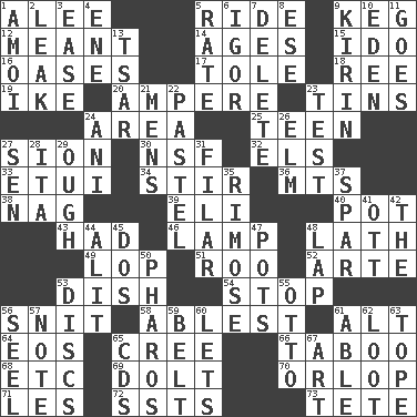 ACROSS 1. Toward shelter 5. Travel on or in a vehicle 9. Barrel 12. Intended 14. Eras 15. Wedding promise 16. Fertile tracts in a desert 17. Lacquered or enameled metalware 18. To sift 19. Mamie's mate 20. Electrical Unit 23. Airtight sealed metal containers 24. Length times width 25. Adolescent 27. The Jewish people; Israel 30. Overdraft (abbr.) 32. Raised railways 33. Needle holder 34. Use a swizzle stick 36. Mountains (abbr.) 38. Tired old horse 39. Biblical high priest 40. Plant holder 43. Possessed 46. Desk light 48. Thin strip of wood or metal 49. Trim (branches) 51. Friend of Pooh 52. Johnson of "Laugh-In" 53. Food container 54. Halt 56. In a ____ (agitated or irritated) 58. Most capable 61. Keyboard modifier key 64. Greek goddess of the dawn 65. Algonquian 66. Off limits 68. And so on (abbr.) 69. Dunce 70. Fourth or lowest deck 71. French article 72. Fast planes 73. False hair DOWN 1. Mine, in Marseilles 2. Path through which fluid escapes 3. Comfort 4. Compass dir. 5. Pace 6. Composer Stravinsky 7. Keyboard key 8. Compass dir. 9. Japanese brewing company 10. Paradise 11. Travels 13. Russian ruler of old 21. Not women's 22. Soft color 23. Trial 24. Cuckoo 26. Shade tree 27. Elected rep. 28. Call ___ day 29. Ending for "Through" and "Enough" 31. Having threads 35. Full of chinks, cracks, or crevices 37. Coast Guard woman 41. Baseball player Mel 42. Definite Article 44. Set down 45. Two (Sp.) 47. Plant holders 48. Pet locale 50. N Egypt peninsula 53. Plates 55. "Beetle Bailey" pooch 56. Sew up the eyelids of hawks and falcons 57. Brief written record 59. Waist strap 60. Allows 61. Competent 62. Spoils 63. Drink excessively 65. Music discs 67. Nonscientific branch of learning