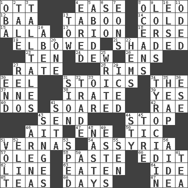 ACROSS 1. Baseball player Mel 4. Comfort 8. Margarine 12. Sound made by sheep 13. Off limits 14. Having a low temperature 15. Silent film actress Nazimova 17. Greek mythologigal hunter 18. Celtic language 19. Shoved, as through a crowd 21. Cast a shadow over 23. Nine, plus one 24. Morning condensation 26. Followers of ems 27. Pace 28. Basketball hoops 30. Snakelike fish 31. Unemotional ones 34. Definite Article 37. Compass dir. 38. Feeling or showing extreme anger 39. Consenting reply 40. Two (Sp.) 41. Flew 42. Actress Charlotte 43. Post 44. Constrict 46. Small island 47. Compass dir. 50. Nervous spasm 51. Actresses Bloom and Felton 54. Nineveh was its capital 57. Cassini of fashion 58. Thick mixture 60. Prepare for publication 62. Actor's bit 63. Consumed 64. Binary compound 65. Beverages made from leaves 66. 24-hour periods 67. Teachers' org. DOWN 1. Chief or king in Benin or Nigeria 2. Story 3. Baron Munchausen's specialties 4. Having ears or earlike features 5. Tolerate 6. "Barney Miller" actor Jack 7. Immeasurably long periods of time 8. Seas 9. Domineers 10. Otherwise 11. Wrote a lyric poem 13. Pull behind 16. Collude with 20. Single 22. Cloth borders 25. Compose 27. Western Nevada city 29. On the rocks 30. Conclusion 31. The Jewish people; Israel 32. Buy and sell 33. Boat paddle 34. Polypeptide antibiotic 35. Pile 36. Compass dir. 41. Stalk of a moss capsule 43. Scorches 44. Filthy place 45. Hoop that covers a wheel 46. Sports stadium 48. Characterized by obscenity 49. _____ Park, CO 51. Electrical Unit 52. Writer Wiesel 53. Drove too fast 55. Elected rep. 56. Helper 59. American Automobile Association (abbr.) 61. Afternoon social gathering