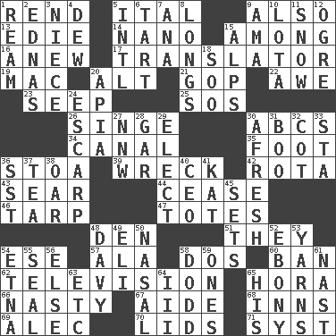 ACROSS 1. Tear apart 5. Slanted text style (abbr.) 9. In addition 13. Singer Brickell 14. Billionth: prefix 15. Amid 16. Afresh 17. Interpreter 19. Big _ 20. The first octave above the treble staff 21. Grand Old Party 22. Deep reverence 23. Ooze 25. Mayday 26. Scorch 30. Lettered men learn these first 34. Lessep's creation 35. Pick up the tab 36. Portico 39. Raze 42. Roll call or roster of names 43. Dry up 44. Stop 46. Canvas cover 47. Hauls 48. Lair 51. Those things 54. Compass dir. 57. In the manner of 58. Two (Sp.) 60. Prohibit 62. Boob tube 65. Israeli folk dance 66. Smutty 67. Helper 68. Lodging establishments 69. Actor Baldwin 70. Flaplike coverings 71. System (abbr.) DOWN 1. 480, 500 or 516 sheets of paper 2. Ferber et al. 3. Sibling's daughter 4. Morning condensation 5. International (abbr.) 6. Small pie 7. Santa ___, CA 8. Yearns 9. Nursemaid (var.) 10. Globular water bottle used in Asia 11. Frozen precipitation 12. Legendary monster 15. High mountains 18. "Barney Miller" actor Jack 20. Capital of Western Samoa 24. Fortification 27. Compass dir. 28. Slender fish 29. Opt 30. Anew 31. Oct. 31 cry 32. Small bed 33. R.R. building 36. Fast jet (abbr.) 37. Afternoon social gathering 38. Rowing implement 40. Corporate head (abbr.) 41. Krazy ___ of comics 45. Puts into a specified state 48. _ Jones' Locker 49. Connecticut Ivy Leaguer 50. Rhinal 52. Dark wood 53. Entertaining tales 54. Inactive volcano in Sicily 55. Lick closed 56. Otherwise 58. Texas town _ City 59. Washington bills 61. Political cartoonist Thomas 63. And so on (abbr.) 64. One more than two 65. Part of HMS, perhaps