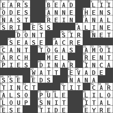 ACROSS 1. Hearing organs 5. Necklace unit 9. Cards in a Roman deck? 12. Lyric poems 13. Singer Murray 14. Coop moms 15. Political cartoonist Thomas 16. It's straight from the horse's mouth 17. Of or related to the anus 18. _ Lanka 19. Curvy letter 21. Place in a line 22. Do not 24. Title for a knight 26. Fish or hair follower 27. Gospel singer Marvin 28. Measure of real estate 29. Patter 30. Ancient Roman robes 32. Mine, in Marseilles 36. Bowlike part 37. Cartoonist voice _ Blanc 38. Monthly bill 39. Sliced desserts 40. Middle Eastern gold or silver currency 42. South American Indian 43. Electrical Unit 44. Dodge 46. Compass dir. 49. Begley and Asner 50. Grandmother 51. A color or tint 53. Teat (slang) 54. Auto 57. In addition 58. Whine 61. _ and Stitch 62. Central Nebraska county 63. In a ____ (agitated or irritated) 64. Slanted text style (abbr.) 65. Compass dir. 66. Event that recurs at intervals 67. Jane of fiction DOWN 1. Immeasurably long periods of time 2. The sixth month of the Jewish calendar 3. Home 4. Fast jet (abbr.) 5. Taverns 6. Compass dir. 7. Black tropical American cuckoo 8. Lair 9. Soviet premier 1918-24 10. Empty; void 11. Small island 14. Actor Linden 19. Followers of ems 20. Proofreading order 21. "We ___ not amused" (Victoria) 23. Expletives 24. Any of the three canals of the cochlea 25. Big collection agency 27. Indian skirt 28. Rep 29. Head covering 31. Leaves out 32. Believer in; advocate of (suffix) 33. Ananias' fault 34. Single time 35. Call ___ day 40. June honoree 41. Painter Guido (1575-1642) 43. Soggy 45. Large container 46. Showing deterioration from age 47. Grain storage towers 48. Follow as a consequence or result 52. Police officer (slang) 53. False hair 55. Having or resembling wings 56. Hero or heavy, e.g. 58. Pacific Standard Time (abbr.) 59. Corn or form start 60. Hat (slang) 61. Whopper