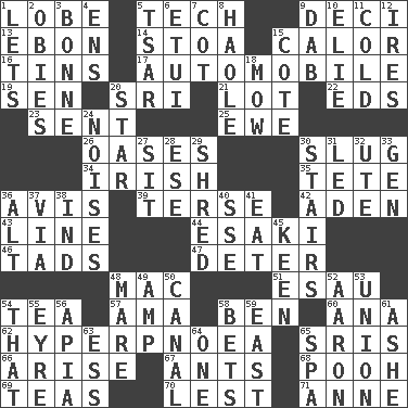 ACROSS 1. Ear part 5. Technician 9. Tenth: prefix 13. Inky black, to poets 14. Portico 15. Bodily heat indicating an inflammation 16. Airtight sealed metal containers 17. Car 19. Elected rep. 20. Indian title of respect (Mr.) 21. Car dealer's back yard 22. Begley and Asner 23. Emitted 25. She-sheep 26. Fertile tracts in a desert 30. Snaillike creature with no shell 34. From or relating to Ireland 35. False hair 36. Deliberation 39. Laconic 42. An important port of Yemen 43. Actor's bit 44. 1973 Nobel Price Winner (Physics) Leo 46. Small boys 47. Prevent from occurring 48. Apple computer (short form) 51. Son of Isaac 54. Beverage made from leaves 57. Wet nurse (var.) 58. Benjamin's nick name 60. Santa ___, CA 62. Abnormally rapid or deep breathing 65. Indian titles of respect 66. Ascend 67. Pismires 68. "Silly old bear" 69. Beverages made from leaves 70. For fear that 71. Queen of England 1702-14 DOWN 1. Allows 2. Off-Broadway awards 3. Child's nurse 4. Followers of ems 5. Russian ruler of old 6. Needle holder 7. Small bed 8. White Person, in Hawaii 9. Pat or tap gently 10. Writer Wiesel 11. Having a low temperature 12. Angers 15. ____ d'Azur (French Riviera) 18. Cut the grass 20. Play the lead 24. Annoying sounds 27. Be seated 28. Compass dir. 29. Fragment 30. Flight of steps 31. Directed 32. Shoshoni 33. Commissioned mil. rank 36. Keyboard modifier key 37. By way of 38. Working for oneself (abbr.) 40. Compass dir. 41. Erode 45. Peachy ____! 48. Female horse 49. Electrical Unit 50. Lessep's creation 52. Composer Copland 53. The state of being joined or united 54. Not this but _ 55. Jane of fiction 56. Capital of Western Samoa 58. Antes 59. 90 degrees 61. American tennis player Robert 63. Double-curved letter 64. Single 65. Health resort