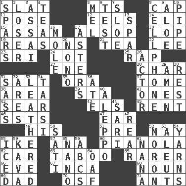 ACROSS 1. Narrow board 5. Mountains (abbr.) 8. Head covering 11. Airs 12. Snakelike fish 14. Biblical high priest 15. Indian state 17. Columnist Joseph or Stewart 18. Trim (branches) 19. Thinks logically 21. Afternoon social gathering 22. Area sheltered from the wind 23. Indian title of respect (Mr.) 24. Car dealer's back yard 25. Reproach for some lapse or misdeed 27. Compass dir. 28. Burn to charcoal 31. Table seasoning 35. Mouth or opening 37. Heavy book 38. Length times width 39. R.R. building 41. Washington bills 42. Dry up 43. Raised railways 45. Monthly bill 46. Fast planes 47. Ewer handle 49. Part of HMS, perhaps 51. Before (prefix) 52. Can I? 55. D.D.E's nickname 57. Santa ___, CA 60. Player piano 62. Auto 63. Off limits 65. Less widely known 66. First lady 67. South American Indian 68. Part of speech 69. June honoree 70. Order of Saint Francis (abbr.) 71. Pismires DOWN 1. Practice fights 2. Failure 3. Slender Brazilian palm 4. Beverages made from leaves 5. Cartoonist voice _ Blanc 6. Trial 7. A type of plum 8. Portable communications device 9. _ vera 10. Corncob 13. Coast Guard woman 16. Undercover agent 17. Michaelmas daisies 20. Words to Nanette 26. Thespian 29. So be it 30. Take ten 31. Backtalk 32. Ancient Greek god of war 33. Tough but pliablecoriaceous 34. Tarsus (plural) 36. Had dinner 40. City in Syria 44. Indian skirt 48. Stern 50. Suttee (variant) 52. Person of subnormal intelligence 53. Native American of Southwest Alaska 54. Entertaining tales 55. On the rocks 56. Polynesian shrub of the pepper family 58. Billionth: prefix 59. Lettered men learn these first 61. Nanny 64. Clumsy lout