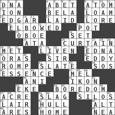 ACROSS 1. Heredity factor (abbr.) 4. Collude with 8. Smallest unit of an element 12. Electrically charged atom 13. Actor Lugosi 14. Rich soil 15. _ Allan Poe 18. Put down 19. Old wives' tales, e.g. 20. Shoved, as through a crowd 22. Cooking vessel 23. Mitch Miller's instrument 24. Arrange properly for use 25. _ moment's notice (2 wds.) 26. Window treatment 30. Was introduced to 33. Make or become more lively 36. Pulitzer Prize-winning author Ferber 37. Mouths or openings 39. Title for a knight 40. Whirlpool 41. Play 42. Schedule 44. Distress signal 45. Core 47. Cartoonist voice _ Blanc 50. Black tropical American cuckoo 51. Picture 53. Supplement with great effort 54. Mood resulting from idleness 57. 43,560 square feet 59. Volcanic refuse 61. Grain storage towers 63. Den 64. Frame or body of a ship 65. Keyboard modifier key 66. Ancient Greek god of war 67. Dwelling 68. Teachers' org. DOWN 1. Expire 2. Thickened enlargement 3. White American of non-Hispanic descent 4. Competent 5. Necklace unit 6. Biblical high priest 7. Bit 8. One to whom something is allotted 9. A blast of a horn 10. Boat paddle 11. Madame (abbr.) 16. Swedish rock group 17. Carrot, for example 21. Welt 22. For each 24. Player for Phoenix 26. Foregone conclusion 27. Does sums 28. _ china 29. Negative votes 30. Greater amount 31. Greek god of love 32. Scottish caps 34. Small island 35. By way of 38. Orators 42. _-fi 43. Arab leader 46. Compass dir. 48. Supplements with great effort 49. Farming town in central California 52. Pitcher Ryan 53. 4th largest of the Great Lakes 54. Lip ointment 55. Stare at amorously 56. Undercover agent 57. Chicken ___ king 58. 4-wheeled motor vehicle 59. Quiet! 60. Nilotic language 62. R.R. building