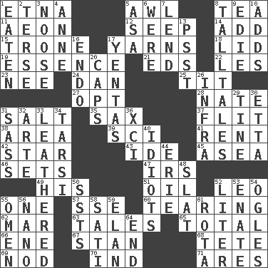 ACROSS 1. Inactive volcano in Sicily 5. Leather borer 8. Afternoon social gathering 11. Period of immesurable duration 12. Ooze 14. Find the sum of 15. Heavy duty weighing machine 17. Entertaining tales 18. Hat (slang) 19. Core 21. Begley and Asner 22. French article 23. Born 24. One of the 12 tribes of Israel 25. Teat (slang) 27. Choose 28. Nathan's nickname 31. Table seasoning 35. Saxophone 37. Sudden quick movement 38. Length times width 39. _-fi 41. Monthly bill 42. Play the lead 43. Binary compound 45. Toward the sea 46. Puts into a specified state 47. Big collection agency 49. Part of HMS, perhaps 51. Petroleum 52. Lion 55. Single 57. Compass dir. 60. Lacerating 62. Third mo. 63. Lies 65. Add up to 66. Compass dir. 67. Comedian Laurel of Laurel & Hardy 68. False hair 69. Allow head to fall sleepily 70. Indiana (abbr.) 71. Ancient Greek god of war DOWN 1. Consumed 2. Laconic 3. Trap for birds or small mammals 4. Queen of England 1702-14 5. White ___ sheet 6. Past tense of be (plural) 7. Grant temporary use of 8. Baron Munchausen's specialties 9. Singer Brickell 10. Sums up 13. Inconspicuous attention getter 16. Inside; within (prefix) 17. Gossips 20. Balmoral and tarboosh 26. Kind of red light 29. Prong on a fork 30. Singer James 31. Backtalk 32. Johnson of "Laugh-In" 33. Tough but pliablecoriaceous 34. Tarsus (plural) 36. One more than ninety 40. Foolish or stupid persons 44. 4th largest of the Great Lakes 48. Narrow board 50. Fast planes 52. 61 cubic inches 53. Related on the mother's side 54. Stares 55. Presage 56. Billionth: prefix 58. Suttee (variant) 59. Style 61. Round or rotation of duties 64. Conclude