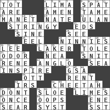 ACROSS 1. Small child 4. Pale green bean 8. Petty quarrel 12. "We ___ not amused" (Victoria) 13. So be it 14. Docile 15. French painter Edouard 18. Nathan's nickname 19. ____ Bator, Mongolia 20. Slender, wiry 22. Begley and Asner 23. Trig term 24. Perceive with the eye 25. Snakelike fish 26. Fools 30. Area sheltered from the wind 33. Member of a famous L.A. basketball team 36. Lacquered or enameled metalware 37. Scent 39. Teachers' org. 40. In a ____ (agitated or irritated) 41. French philosopher Descartes 42. White American of non-Hispanic descent 44. Ocean 45. Motivate 47. Girls' org. (abbr.) 50. Baseball player Mel 51. Monthly bill 53. Big collection agency 54. Leopard's kin 57. Do not 59. A type of plum 61. Citrus fruits 63. Single time 64. I made a mistake 65. Compass dir. 66. Singe 67. System (abbr.) 68. Fast jet (abbr.) DOWN 1. Scottish cap 2. Mouths or openings 3. Portable shelters 4. Austrian-born American filmmaker Fritz 5. "If ____ say so..." 6. Was introduced to 7. One (Scot) 8. SAT takers 9. Friends 10. Housemaid (var.) 11. Nine, plus one 16. 4th largest of the Great Lakes 17. Prong on a fork 21. 1994 drama film starring Jodie Foster 22. Car or cant ending 24. Title for a knight 26. Anneal 27. Charged particles 28. Writer Wiesel 29. Stalk of a moss capsule 30. Australian parrot (variant) 31. Paradise 32. Immeasurably long periods of time 34. Singer Murray 35. Cask 38. Newsperson 42. Nonscientific branch of learning 43. Legendary monster 46. ___ a Wonderful Life 48. Sew up the eyelids of hawks and falcons 49. Against 52. Makes less strong or intense 53. South American Indian 54. 911 reaches them 55. Behest 56. Coop moms 57. Two (Sp.) 58. Single 59. Mayday 60. Myrna of the movies 62. Put into a specified state