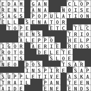 ACROSS 1. Dutch treat 5. Separate the seeds from cotton 8. Hoof sound 12. Monthly bill 13. Santa ___, CA 14. Annoying sound 15. Settles 16. Census information 19. Pipe bend 20. Legislator 21. Drink excessively 23. And so on (abbr.) 24. Affectionate concern, for short 27. Coop moms 30. Musical group of three 31. City in Syria 34. Assist 35. Composer Stravinsky 38. Nest on high 40. Vintage cars 41. Printing process, for short 42. Erase 44. Pismires 45. A type of plum 46. Modern: prefix 47. Two (Sp.) 50. Russian ruler of old 53. Stimulate to action 57. Plant excrement 59. Supplying deficiencies 63. "____ silly question..." 64. Drop behind 65. Baking dish 66. Adolescent 67. Assistant 68. Compass dir. 69. Extremities DOWN 1. Celtic language 2. Started a card game 3. White American of non-Hispanic descent 4. Mountains (abbr.) 5. Stare wonderingly 6. Soon (poet.) 7. California wine valley 8. Small bed 9. Cards in a Roman deck? 10. Bear (Spanish) 11. Writing instrument 14. Drug cop 17. Shoshoni 18. Car dealer's back yard 20. Sew up the eyelids of hawks and falcons 22. N Egypt peninsula 24. Woody plant 25. _ and Stitch 26. 911 reaches them 28. Teachers' org. 29. Broke a traffic law 30. Trios 32. Before (prefix) 33. Lubricates 35. SW Asia republic 36. Went 37. Von Bismarck 39. Snakelike fish 43. Carryall 47. Deli pickle 48. Single 49. Fast jet (abbr.) 51. NE Netherlands city 52. Swept the length of 54. Corncob 55. "Terrible" tsar 56. French philosopher Descartes 58. Baking dishes 59. R.R. building 60. RI univ. 61. Groovy apt. 62. Sliced dessert 63. Had dinner