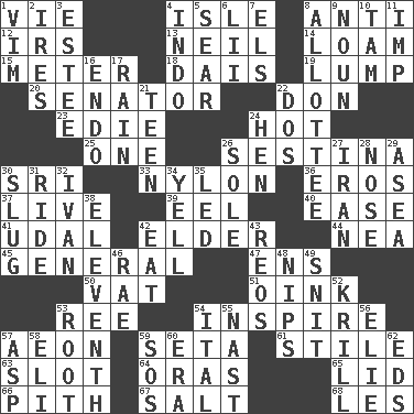 ACROSS 1. Compete 4. Capri or Wight 8. Against 12. Big collection agency 13. Famous astronaut Armstrong 14. Rich soil 15. Distance measurement 18. Raised platform 19. Mass 20. Legislator 22. Spanish title 23. Singer Brickell 24. Being at a high temperature 25. Single 26. French poetic form 30. Indian title of respect (Mr.) 33. High-strength synthetic material 36. Greek god of love 37. Not recorded 39. Snakelike fish 40. Comfort 41. Allodial 42. A person who is older than you are 44. Teachers' org. 45. Commissioned military rank 47. Followers of ems 50. Large container 51. Pig sound 53. To separate or throw off 54. Motivate 57. A really long time 59. Stalk of a moss capsule 61. Vertical member of a panel or frame 63. Slit 64. Mouths or openings 65. Hat (slang) 66. Essential or central part 67. Table seasoning 68. French article DOWN 1. Zeal 2. Angers 3. First name in cosmetics 4. _ china 5. Burn superficially 6. Cards in a Roman deck? 7. Raised railways 8. One to whom something is allotted 9. Part of speech 10. Scottish cap 11. Naughty child 16. Inside; within (prefix) 17. Water falling in drops from the sky 21. Adolescent 22. Two (Sp.) 24. Layer 26. Not divided or shared with others 27. SW Asia republic 28. Sense of smell 29. At sea 30. Snaillike creature with no shell 31. Travel on an animal 32. _ the terrible 34. Shout 35. Directed 38. Veterans Day date 42. Ingest 43. Vintage cars 46. Actress Charlotte 48. Cuts off 49. In a ____ (agitated or irritated) 52. The principal food of baleen whales 53. Carrot, for example 54. Slanted text style (abbr.) 55. Political cartoonist Thomas 56. Writer Wiesel 57. Cleo's killer 58. Biblical high priest 59. Distress signal 60. Epoch 62. Begley and Asner
