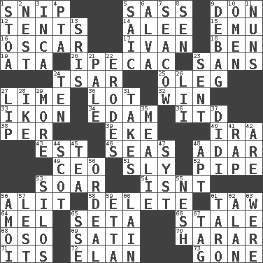 ACROSS 1. Sever or remove by pinching or nipping 5. Backtalk 9. Spanish title 12. Portable shelters 14. Toward shelter 15. Australian flightless bird 16. Witty Wilde 17. _ the terrible 18. Benjamin's nick name 19. "One Day ___ Time" 20. Medicinal drug used to evoke vomiting 23. Without 24. Russian ruler of old 25. Cassini of fashion 27. Citrus frut 30. Car dealer's back yard 32. Acquire through effort 33. Visual representation of an object 34. Dutch treat 36. It would 38. For each 39. Supplement with great effort 40. Retirement account (abbr.) 43. Eastern Standard Time (abbr.) 46. Oceans 48. The sixth month of the Jewish calendar 49. Corporate head (abbr.) 51. Cunning 52. Corncob 53. Fly high 54. Is not 56. Came down and settled, as after flight 58. Erase 61. The 23rd letter of the Hebrew alphabet 64. Cartoonist voice _ Blanc 65. Bristle 66. Lacking originality or spontaneity 68. Bear (Spanish) 69. Suttee (variant) 70. Ethiopian city, capital of Harari 71. It is 72. Liveliness 73. Went DOWN 1. Portico 2. A home for chicks 3. South American Indian 4. Parent Teacher Assoc. 5. Ketch in the Levant 6. Inventor's middle name 7. Manatee 8. Elected rep. 9. Debunk (Brit. slang) 10. Presage 11. Religious women 13. Indian titles of respect 21. Light colored 22. Eats (away) 23. Posted 24. Nine, plus one 26. Cards in a Roman deck? 27. Mouth edge 28. D.D.E's nickname 29. Greater amount 31. Receives possession of 35. Ear of corn 37. "You Light Up My Life" star Conn 41. Reproach for some lapse or misdeed 42. "We ___ not amused" (Victoria) 44. Highlander 45. Afternoon social gathering 47. System (abbr.) 48. Fitting 50. Severe or trying experience 53. Grain storage towers 55. Delicate 56. Mine, in Marseilles 57. For fear that 59. Singer James 60. (Had) reclined 61. Pacific island yam 62. Actor Alda or Thicke 63. We are 65. Compass dir. 67. Label