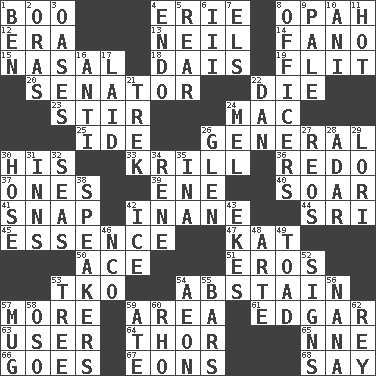 ACROSS 1. Surprise greeting 4. One of the Great Lakes 8. Brightly colored fish 12. Period 13. Famous astronaut Armstrong 14. Papal veil 15. Rhinal 18. Raised platform 19. Sudden quick movement 20. Elected representative 22. Expire 23. Tumult 24. Big _ 25. Binary compound 26. Commissioned military rank 30. Part of HMS, perhaps 33. The principal food of baleen whales 36. Redecorate 37. Singles 39. Compass dir. 40. Fly high 41. Fastener 42. Empty; void 44. Indian title of respect (Mr.) 45. Gist 47. Krazy ___ of comics 50. Adept person 51. Greek god of love 53. Ring climax 54. Refrain by choice 57. Greater amount 59. Length times width 61. _ Allan Poe 63. One who uses or employs something 64. Son of Odin 65. Compass dir. 66. Moves 67. Immeasurably long periods of time 68. Declare DOWN 1. Benjamin's nick name 2. Mouths or openings 3. Fertile tracts in a desert 4. Inside; within (prefix) 5. Posterior 6. One more than two 7. Raised railways 8. Persons of authority 9. Diluted with white 10. Black tropical American cuckoo 11. Being at a high temperature 16. Against 17. Put down 21. Long journey 22. One of the 12 tribes of Israel 24. Cartoonist voice _ Blanc 26. Small, secluded valley 27. Vintage cars 28. The sixth month of the Jewish calendar 29. Australian parrot (variant) 30. Flexible conduit 31. Restaurants 32. Oceans 34. French philosopher Descartes 35. _ tizzy (2 wds.) 38. Orators 42. Frozen water 43. Supplements with great effort 46. Non-commissioned officer (abbr.) 48. Johnson of "Laugh-In" 49. Frog relative 52. Signals 53. Woody plant 54. Period of immesurable duration 55. Drinking establishments 56. Nanny 57. Large cup 58. Bear (Spanish) 59. Had dinner 60. 17th letter of the Greek alphabet 62. Marina Del _, California