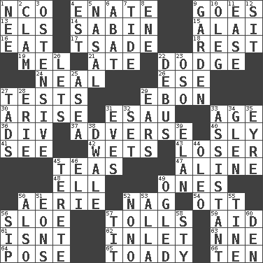 ACROSS 1. Non-commissioned officer (abbr.) 4. Related on the mother's side 9. Leaves 13. Raised railways 14. Unit of acoustic absorption 15. Jai _ 16. Ingest 17. Sadhe (variant) 18. Repose 19. Cartoonist voice _ Blanc 21. Had dinner 22. Evade 24. Anneal 26. Compass dir. 27. Trials 29. Inky black, to poets 30. Get up 31. He sold his birthright 33. Mature 36. HTML Container Element 37. Contrary to your interests or welfare 40. Wily 41. Observe 42. Moistens 43. Failure 45. Afternoon social gatherings 47. Place in a line 48. Pipe bend 49. Singles 50. Nest on high 52. Tired old horse 54. Baseball player Mel 56. _ gin 57. For Whom the Bell _____ 59. Assist 61. Is not 62. An arm off of a larger body of water 63. Compass dir. 64. Introduce or present, as a question 65. Sycophant 66. "___ Little Indians" DOWN 1. Born 2. Dollar (slang) 3. Clearly or manifestly demonstrative 4. Eastern Standard Time (abbr.) 5. Relating to the nose 6. Blind as ____ 7. Periodic rise and fall of the sea level 8. Compass dir. 9. Place where plants grow 10. Cassini of fashion 11. Relaxation 12. Be seated 20. Allows 22. To get out of a bus 23. Bear (Spanish) 25. At sea 27. Bits 28. 4th largest of the Great Lakes 29. Hearing organs 31. Nights before holidays 32. Arrange properly for use 33. Helper 34. Small, secluded valley 35. Jane of fiction 38. A sleeping potion; an opiate (poet.) 39. Style 44. Margarine 45. Cylindrical with tapered ends 46. Connecticut Ivy Leaguer 49. Stared 50. In addition 51. Immeasurably long periods of time 52. Words to Nanette 53. Silent film actress Nazimova 55. Prong on a fork 56. Small drink 57. Teat (slang) 58. Filthy place 60. Lair