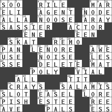 ACROSS 1. "Barney Miller" actor Jack 4. Cause heat under the collar 8. Spoil 11. Connecticut Ivy Leaguer 12. Representative 14. Thickened enlargement 15. Silent film actress Nazimova 17. Trap for birds or small mammals 18. Like ___ of sunshine 19. More impudent 21. Thespian 23. Compass dir. 24. Car or cant ending 25. Three-handed card game 27. San ____ (Riviera town) 30. Baking dish 31. Poe poem 34. Deep reverence 37. Purpose 38. Annoying sound 39. French article 40. Compass dir. 41. Keyboard key 43. Floor protector 44. More than one (prefix) 45. Small bottle 47. Everything 49. Teat (slang) 50. Trading vessels 52. Deli grouping 56. Slit 57. Artist's stand 60. Old wives' tales, e.g. 61. Expression of disdain 62. First name in cosmetics 63. To sift 64. "___ Maria" 65. Friends 66. Double-curved letter DOWN 1. Oceans 2. Rounded earthenware pot or jar 3. Petroleums 4. Indian princess (variant) 5. Russian composer Stravinsky 6. Lion 7. Followers of ems 8. Person of subnormal intelligence 9. The sixth month of the Jewish calendar 10. Marina Del _, California 13. Beverage made from leaves 14. Nathan's nickname 16. Toward the sea 20. International (abbr.) 22. Corporate head (abbr.) 25. Backtalk 26. Leg joint 27. Turbulent 28. Celtic language 29. Rendezvous 30. Product of festering 32. Inside; within (prefix) 33. Christmas carol 34. _ mater 35. Welt 36. Eastern Standard Time (abbr.) 42. Morally bad or wrong 44. Apply oneself diligently 46. Slanted text style (abbr.) 47. Came up 48. Thin strip of wood or metal 49. Lies 50. 154 in Roman numerals 51. Perceive with the eye 52. Stitch closed the eyes of (a falcon) 53. Greater amount 54. Angers 55. Observes 56. Health resort 58. Viper 59. R.R. building