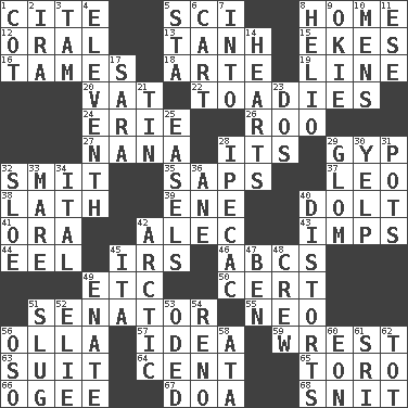 ACROSS 1. Quote 5. _-fi 8. Residence 12. Of the mouth 13. Hyperbolic tangent 15. Makes supply last 16. Domesticates 18. Johnson of "Laugh-In" 19. Actor's bit 20. Large container 22. Sycophants 24. One of the Great Lakes 26. Friend of Pooh 27. Grandmother 28. It is 29. Hustle 32. Stricken, poetically 35. Plant excrements 37. Lion 38. Thin strip of wood or metal 39. Compass dir. 40. Dunce 41. Mouth or opening 42. Actor Baldwin 43. Naughty children 44. Snakelike fish 45. Big collection agency 46. Lettered men learn these first 49. And so on (abbr.) 50. Sure thing 51. Legislator 55. Modern: prefix 56. Spanish pot 57. The content of cognition 59. Take or capture by force 63. Set of matching outer garments 64. Penny 65. "Corrida" creature 66. Double curve, resembling the letter S 67. ___ good deed 68. In a ____ (agitated or irritated) DOWN 1. Small bed 2. Lyricist Gershwin 3. Scottish cap 4. Veterans Day date 5. R.R. building 6. Haul 7. To the inside or interior of 8. Sun: prefix 9. Migrant worker of the '30s 10. Not women's 11. Compass dir. 14. Centers 17. "Two Mules for Sister ____" 21. Metal container 23. Two (Sp.) 25. Artist's stands 28. Medicinal drug used to evoke vomiting 29. Seize upon or latch onto something 30. Sharp bark 31. Plant holders 32. A type of plum 33. Female horse 34. Slanted text style (abbr.) 36. One (Scot) 40. What propaganda does 42. Northern region 45. Call ___ day 47. Benjamin's nick name 48. Group working together 49. Related on the mother's side 51. A hard, heavy blow 52. Writer Wiesel 53. Wrote a lyric poem 54. Former U.S. Attorney General Janet 56. Bear (Spanish) 58. "One Day ___ Time" 60. Period of immesurable duration 61. _ Lanka 62. Small child