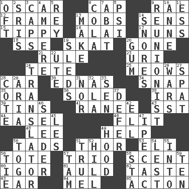 ACROSS 1. Motion picture award 6. Head covering 9. Actress Charlotte 12. Movie unit 13. Crowds into 14. Elected reps. 15. Likely to tip or tilt 16. Jai ____ 17. Religious women 18. Compass dir. 19. Three-handed card game 20. Went 21. General guideline 23. RI univ. 24. Wig 25. Catcalls? 28. 4-wheeled motor vehicle 30. Ferber et al. 34. Fastener 35. Mouth or opening 36. Having a sole or soles 38. Retirement account (abbr.) 39. Airtight sealed metal containers 41. The wife of a rajah (variant) 43. Fast jet (abbr.) 44. Artist's stand 46. Sudden quick movement 48. Area sheltered from the wind 49. Assist 50. Small boys 51. Son of Odin 53. Biblical high priest 56. Carry 57. Musical group of three 58. Aroma 60. Composer Stravinsky 61. Old (Scot.) 62. Clothes sense 63. Ewer handle 64. Cartoonist voice _ Blanc 65. Gambison DOWN 1. Often (poetically) 2. Indian titles of respect 3. Smile enhancers 4. Electrical Unit 5. Marina Del _, California 6. Root beer relative 7. Blind as ____ 8. 23rd letter of the Greek alphabet 9. One who advocates reunion 10. Singer Murray 11. Double-curved letter 13. Cause to be 14. Sounds asleep 19. Bobsleighs 20. Chewing product 22. Shoshoni 24. Interpreter 26. Armed conflicts 27. Argument over a trivial matter 28. ____ d'Azur (French Riviera) 29. Roberta Peters solo 31. Not either 32. Wing 33. Elected rep. 37. Postpone 40. Sowing specialist 42. Pipe bend 45. French article 47. Medicinal drug used to evoke vomiting 49. Parka part 50. Ancient Roman robe 51. Loyal 52. Land elevation 54. For fear that 55. To the inside or interior of 56. Make a knot 57. Scottish cap 58. R.R. building 59. "___ Little Indians"