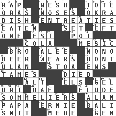 ACROSS 1. Strike 4. Delicate 8. Haul 12. Mouths or openings 14. Olfactory organs 16. Gumbo ingredient 17. Food container 18. Pleas 20. Consumed 22. Put into a specified state 23. Bank Draft (abbr.) 24. Single 25. Eastern Standard Time (abbr.) 28. Cooking vessel 30. Root beer relative 31. Mesonic 35. Sis' sibling 37. Toward shelter 40. Words to Nanette 41. Fermented drink made from hops 42. Puts on (as clothing) 44. Do not 45. Uhlan (variant) 46. Portico 47. Followers of ems 48. Makes less strong or intense 50. Passed on 52. Keyboard modifier key 54. Raised railways 55. Set 58. RI univ. 61. Clumsy lout 63. Dodge 65. Wine waiters 70. ____ Jay Lerner 71. Dad 72. Bert's buddy 73. Indonesian resort city 74. Stricken, poetically 75. Ancient Persian 76. Commissioned military rank (abbr.) DOWN 1. Cowboy competition 2. Believer in; advocate of (suffix) 3. Thick mixture 4. Compass dir. 5. A really long time 6. Fast jet (abbr.) 7. Possessive pronoun 8. Small child 9. Migrant worker of the '30s 10. Not kosher 11. 90 degrees 13. A female animal or person 15. Ooze 19. Smallest unit of an element 21. Modern: prefix 26. Cole _ (cabbage dish) 27. Stories 29. Looked after 30. Pupil covering 32. Within a short period 33. Taverns 34. Small bed 35. Actor Lugosi 36. 480, 500 or 516 sheets of paper 38. Erode 39. Wear away 41. On the contrary 43. Move on water 49. A type of plum 51. Compass dir. 53. Falsehood 55. POW camp 56. Peak District village in England 57. Soviet premier 1918-24 58. United States Postal Service (abbr.) 59. Wander 60. Body of Kaffir warriors 62. Unshakable 64. Experiment locale 66. Floor protector 67. Compass dir. 68. To free from 69. Observe