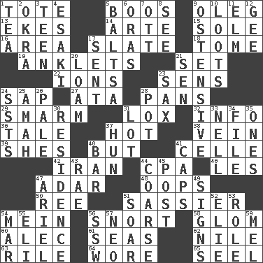 ACROSS 1. Carry 5. Scornful sounds 9. Cassini of fashion 13. Supplements with great effort 14. Johnson of "Laugh-In" 15. Flatfish 16. Type of rug 17. Chalkboard 18. Heavy book 19. Short socks 21. Arrange properly for use 22. Charged atoms 23. Elected reps. 24. Plant excrement 27. _ moment's notice (2 wds.) 28. Baking dishes 29. Excessive but superficial compliments 31. Brine-cured salmon 32. A message received and understood 36. Story 37. Being at a high temperature 38. Distinctive style or manner 39. "______ My Girl" (Turtles hit) 40. On the contrary 41. Cell (Danish) 42. SW Asia republic 44. Accounting whiz (abbr.) 46. French article 47. The sixth month of the Jewish calendar 48. I made a mistake 50. Portuguese money of account (variant) 51. More disrespectful 54. Chow _ 56. Derisive sound 58. Seize upon or latch onto something 60. Actor Baldwin 61. Oceans 62. The longest river in the world 63. Cause heat under the collar 64. Had on 65. Stitch closed the eyes of (a falcon) DOWN 1. Afternoon social gathering 2. Gumbo ingredient 3. Adolescent 4. 1973 Nobel Price Winner (Physics) Leo 5. Greek mezzo-soprano Agnes 6. Mouths or openings 7. Baseball player Mel 8. Perceive with the eye 9. Clearly or manifestly demonstrative 10. Plunders 11. Shade tree 12. Turn to the right 17. Transmitted 20. Rich soil 21. Elected rep. 23. Saxophone 24. Fast planes 25. Nursemaid 26. Light colored 28. Plant holder 30. Dwelling 31. Car dealer's back yard 33. 1994 drama film starring Jodie Foster 34. Do some clerical work 35. Singles 37. Attila the _ 40. Long, evenly shaped piece 41. Smile enhancers 43. Actress Charlotte 44. Rough 45. Mail 47. Satellite of Uranus 49. Omens 51. Fly high 52. Writer Wiesel 53. Hero or heavy, e.g. 54. Spoil 55. Connecticut Ivy Leaguer 56. Compass dir. 57. Modern: prefix 59. Cartoonist voice _ Blanc