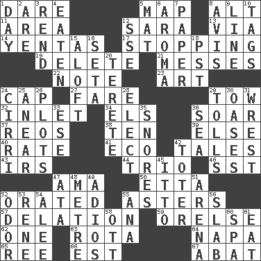 ACROSS 1. Have the gumption 5. Atlas unit 8. The first octave above the treble staff 11. Length times width 12. "Two Mules for Sister ____" 13. By way of 14. Gossips 17. Ceasing 19. Erase 21. Makes clutter 22. Make mention of 23. Nonscientific branch of learning 24. Head covering 27. Conductor's collection 29. Pull behind 32. An arm off of a larger body of water 34. Raised railways 36. Fly high 37. Vintage cars 38. "___ Little Indians" 39. Otherwise 40. Assign a rank or rating to 41. Environmental prefix 42. Lies 43. Big collection agency 44. Musical group of three 46. Fast jet (abbr.) 47. Nanny (var.) 50. Singer James 52. Spoke pompously 55. Michaelmas daisies 57. Accusation by an informer 59. Threatening words 62. Single 63. Round or rotation of duties 64. California wine valley 65. To riddle 66. Eastern Standard Time (abbr.) 67. Blind as ____ DOWN 1. 24 hours 2. "We ___ not amused" (Victoria) 3. Tear apart 4. Ingested 5. Floor covering 6. Odor 7. Some stationery 8. Advice 9. Actor's bit 10. Labels 12. Compass dir. 15. At or to great height 16. Bristle 18. Pacific Standard Time (abbr.) 20. Cylindrical with tapered ends 24. High-altitude cloud 25. Approach 26. Graphs 28. Voters do this 29. For Whom the Bell _____ 30. Fertile tracts in a desert 31. Take or capture by force 33. Compass dir. 35. Sounds asleep 36. Ocean 42. Carrier 45. "Tell ____ the Marines!" 47. "One Day ___ Time" 48. Distance measurement (Brit.) 49. Goodbye (Sp.) 51. Sports stadium 52. Aroma 53. French philosopher Descartes 54. Toward shelter 55. Santa ___, CA 56. Thick slice 58. Baseball player Mel 60. Health resort 61. Consume